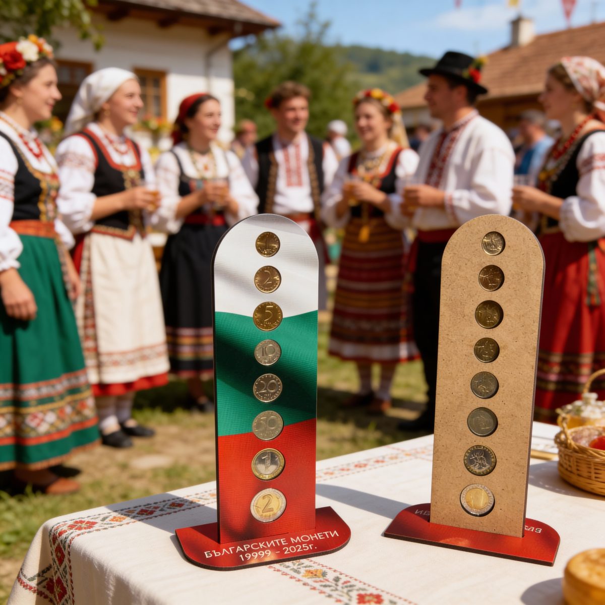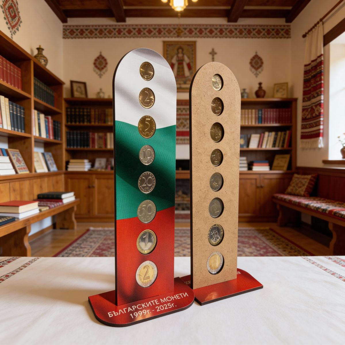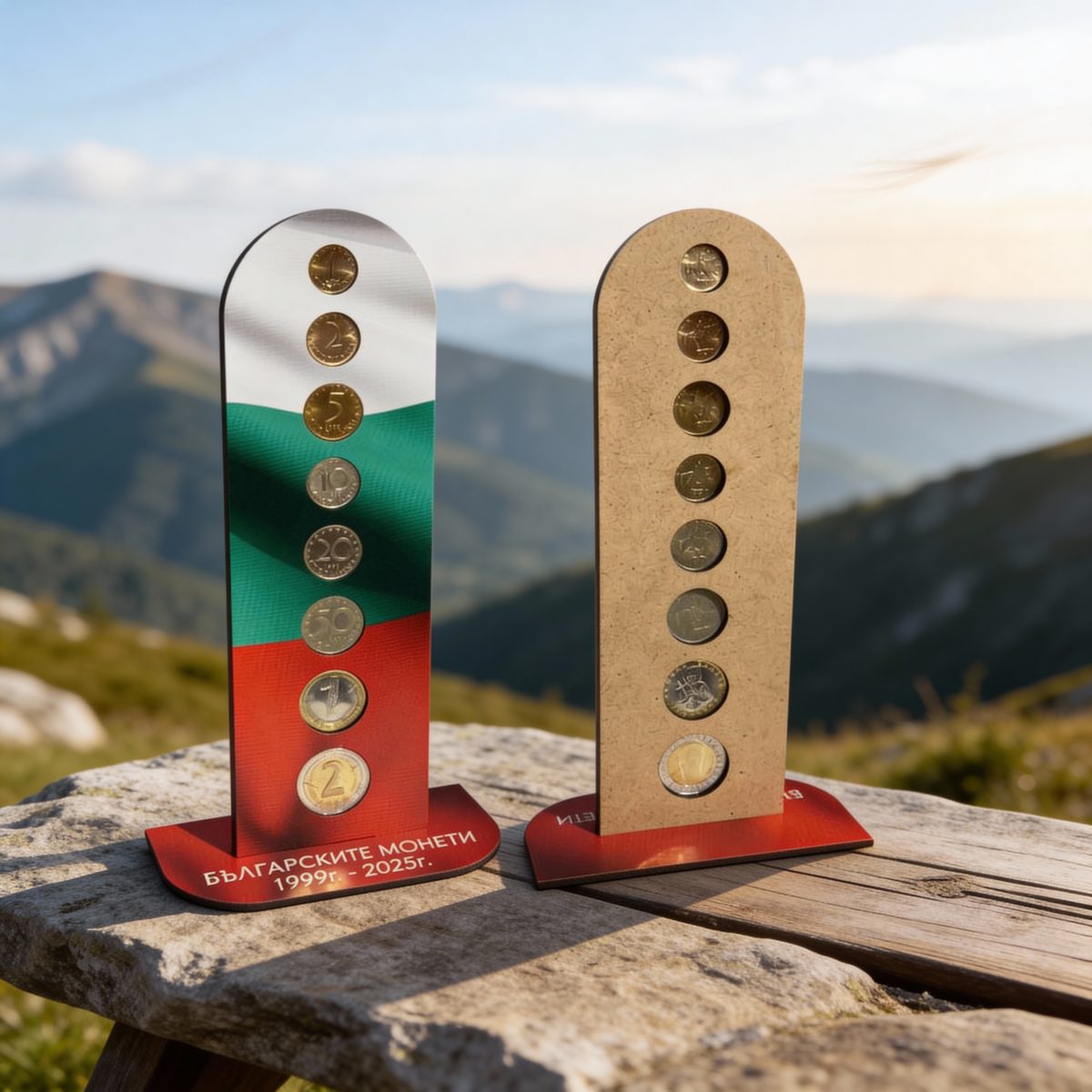 Върху лицевата част са предвидени прецизно оформени позиции за българските разменни монети