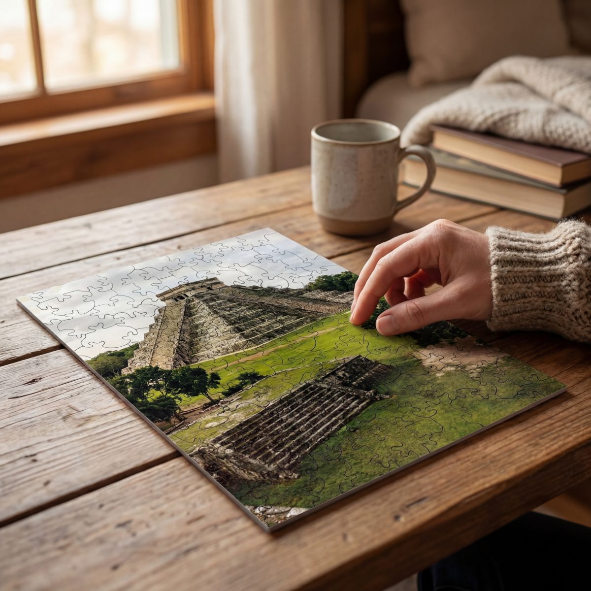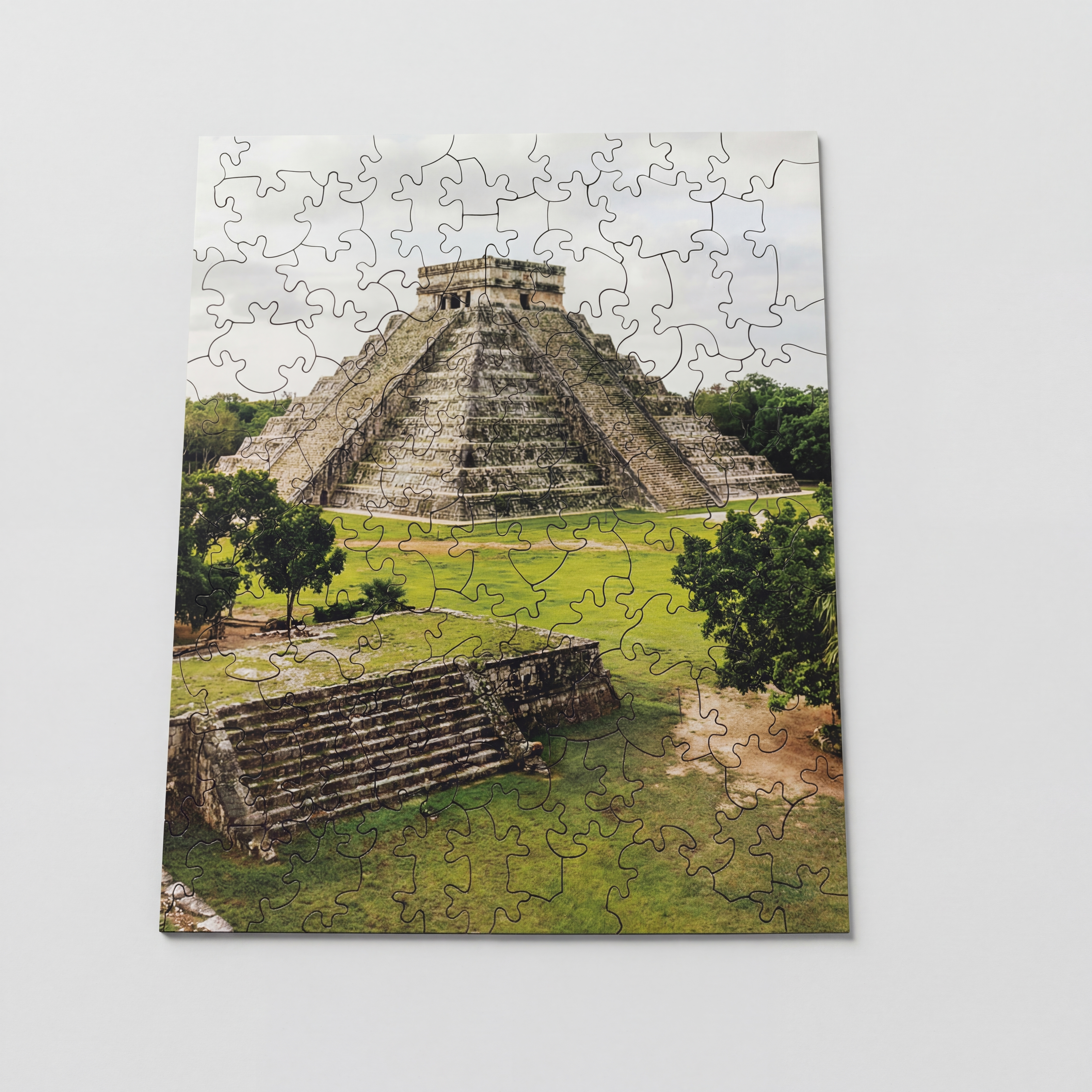 Ръчно изработен декоративен дървен пъзел с изображение на Чичен Ица – един от най-известните археологически и исторически обекти в света. Елегантен и впечатляващ модел, подходящ за подарък, декорация или за всеки, който обича древни цивилизации, пътешествия и емблематични световни забележителности.