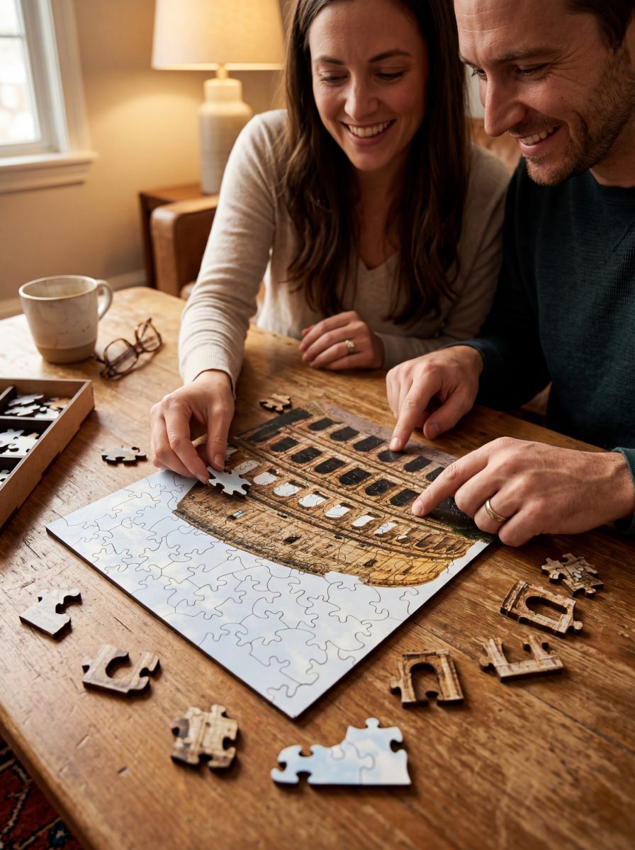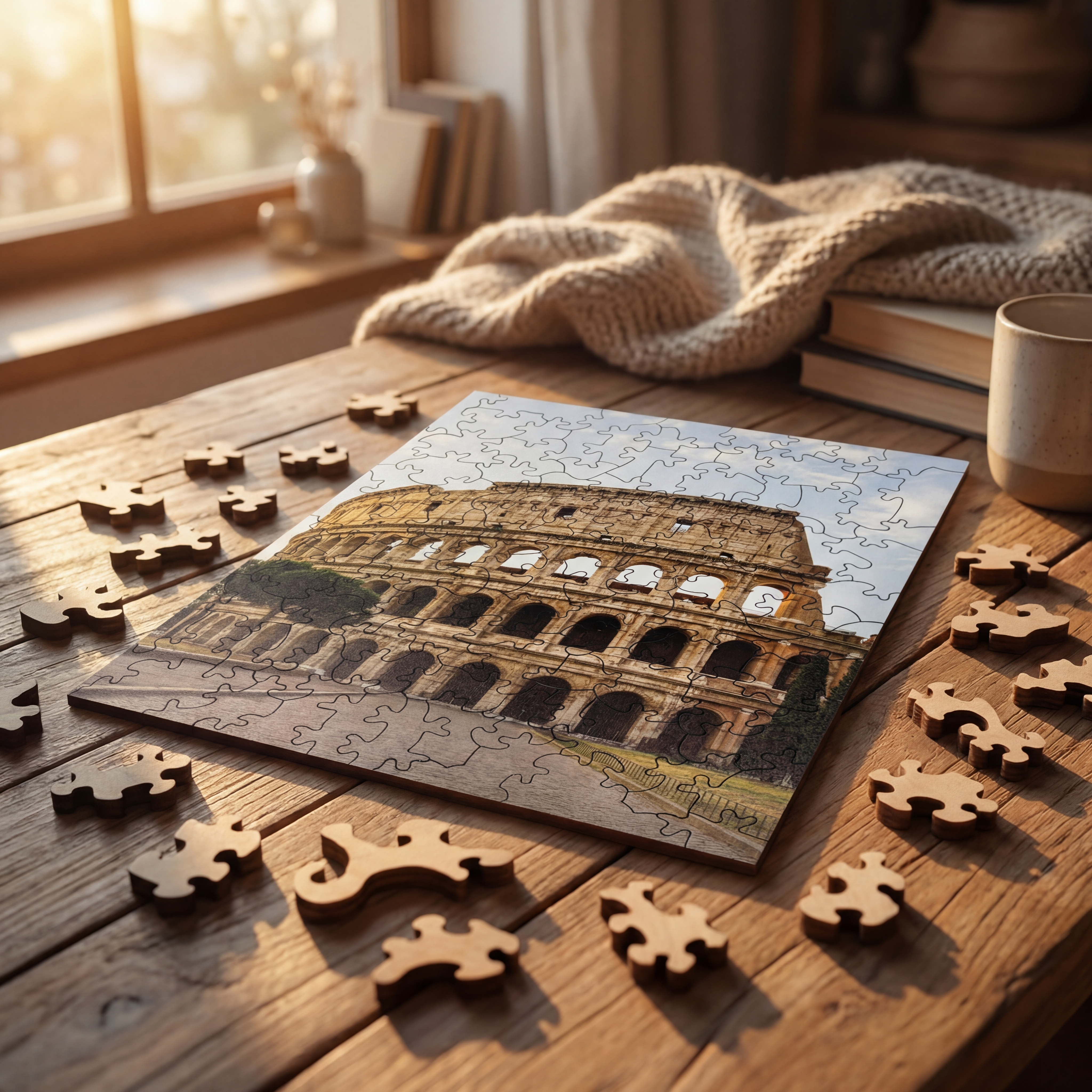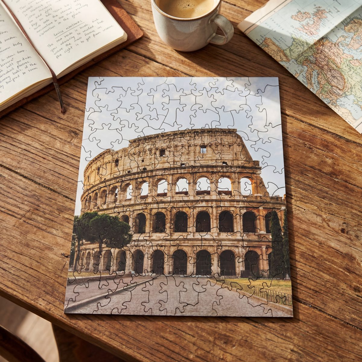 Ръчно изработен декоративен дървен пъзел с изображение на Колизеума в Рим – една от най-емблематичните и разпознаваеми исторически забележителности в света. Елегантен и впечатляващ модел, подходящ за подарък, декорация или за всеки, който обича история, архитектура и световни културни символи.