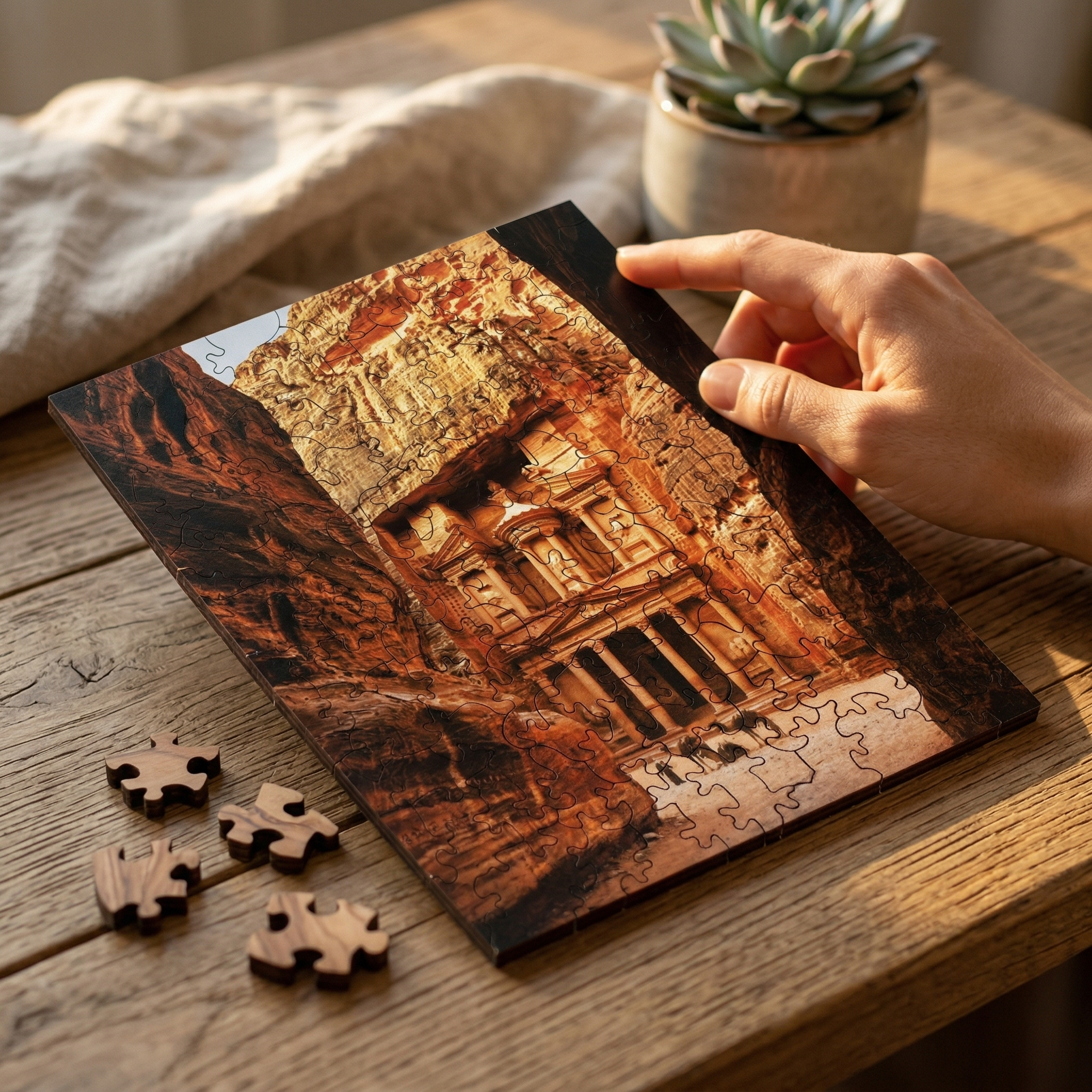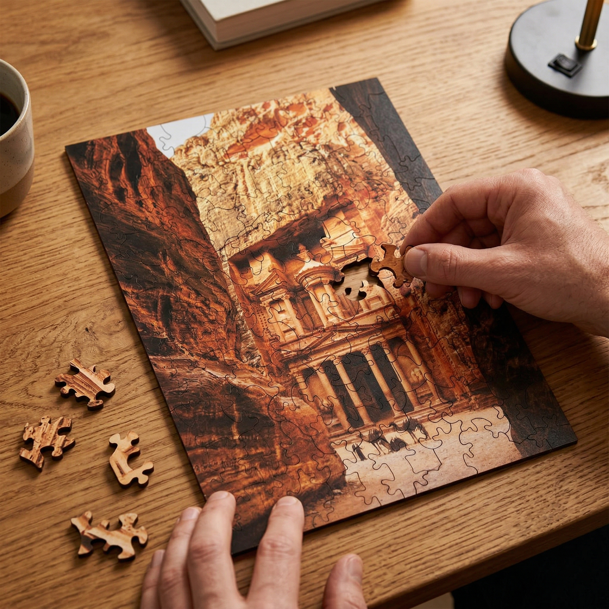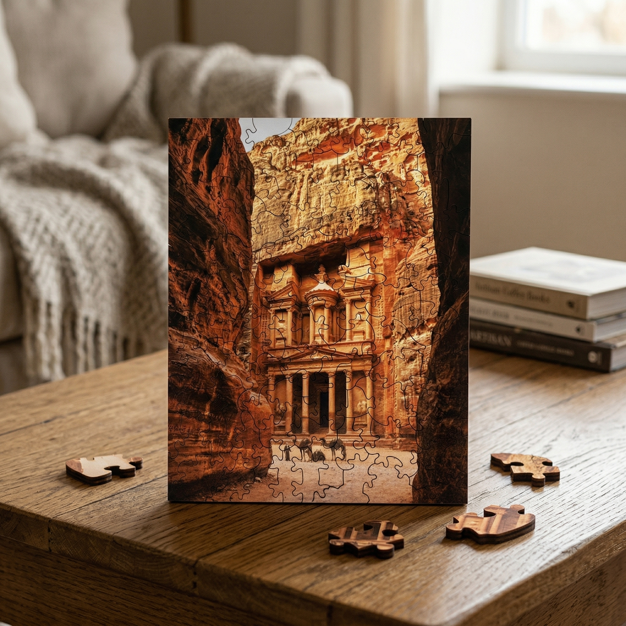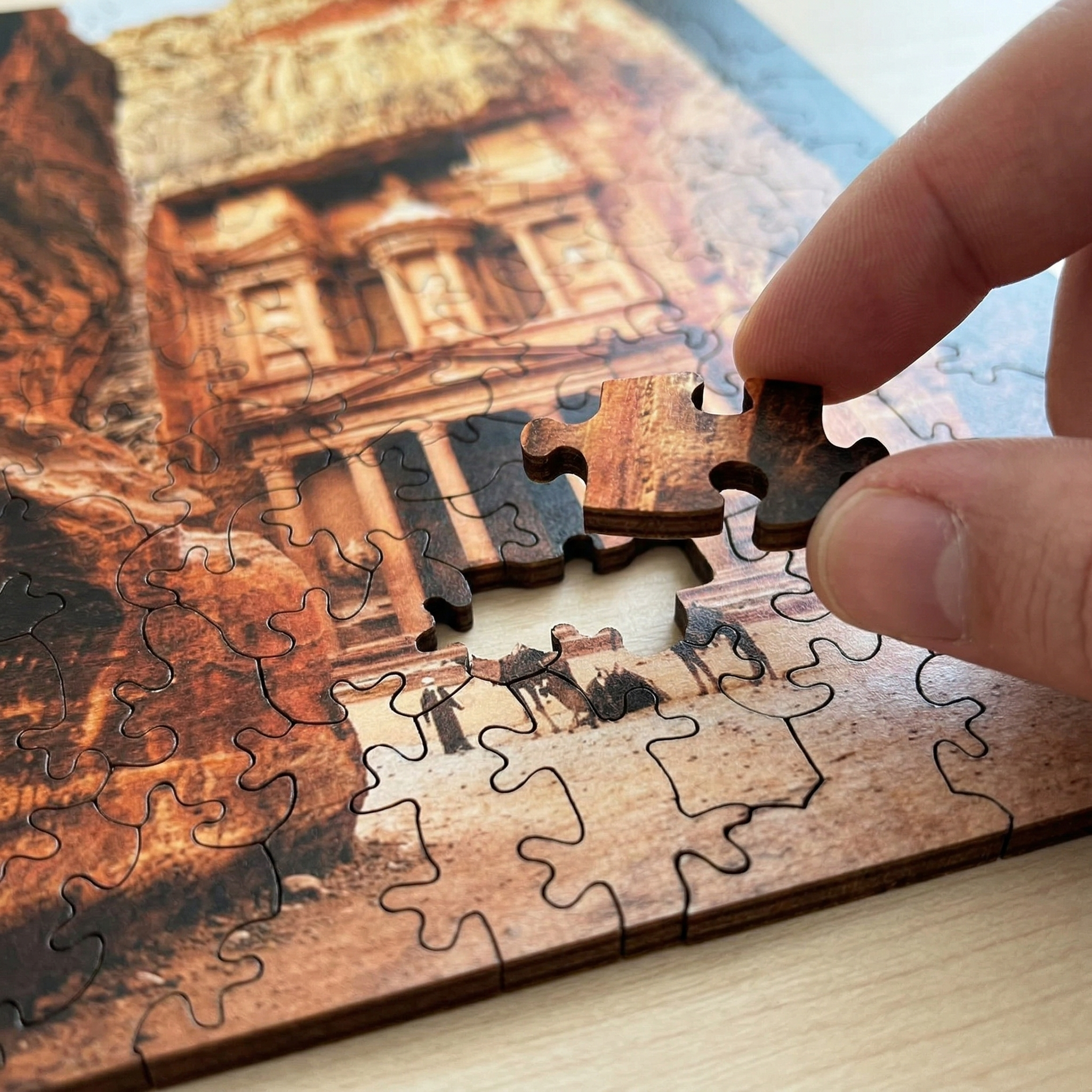 Ръчно изработен декоративен дървен пъзел с изображение на Петра – един от най-впечатляващите археологически и исторически обекти в света. Елегантен и впечатляващ модел, подходящ за подарък, декорация или за всеки, който обича древни цивилизации, пътешествия и емблематични световни забележителности.