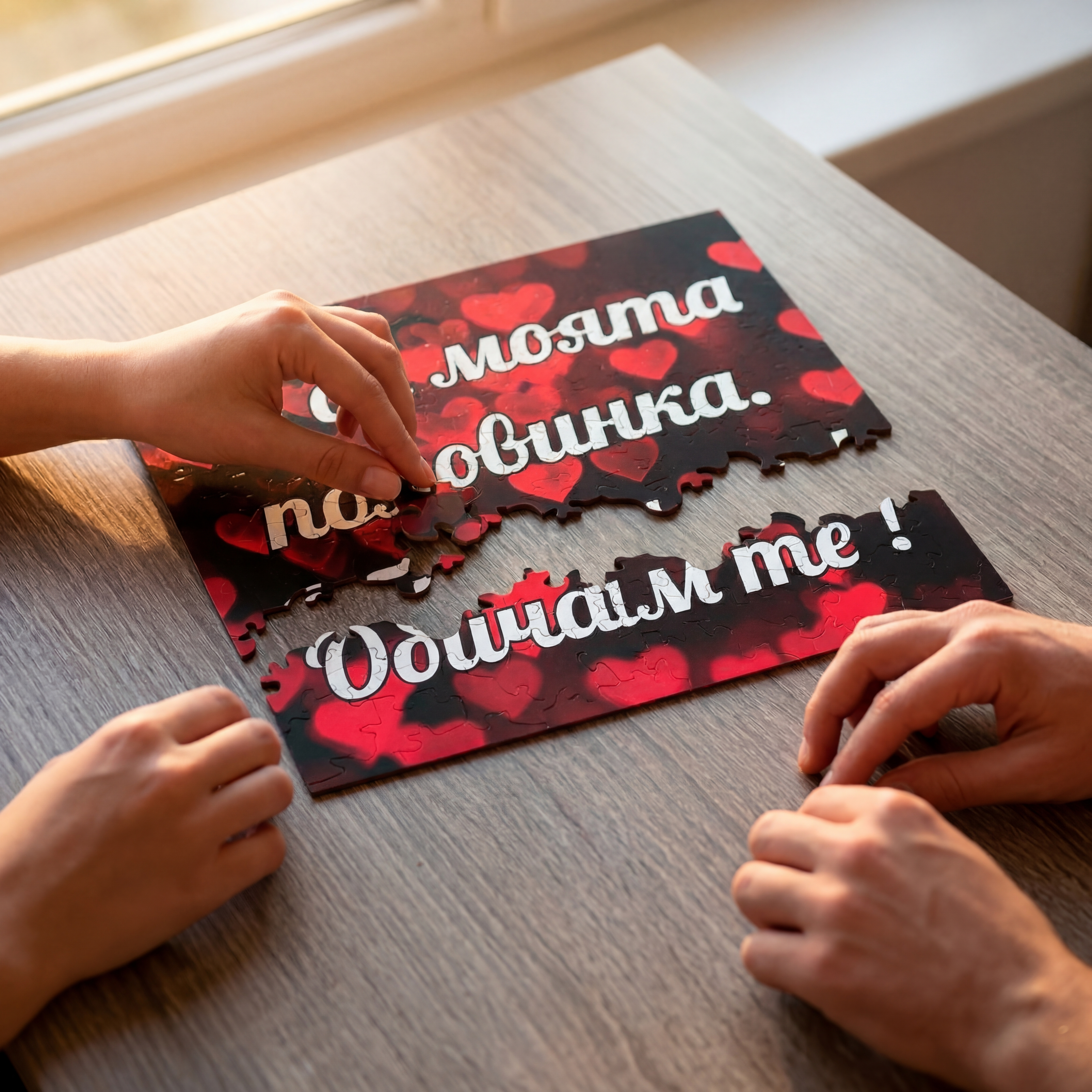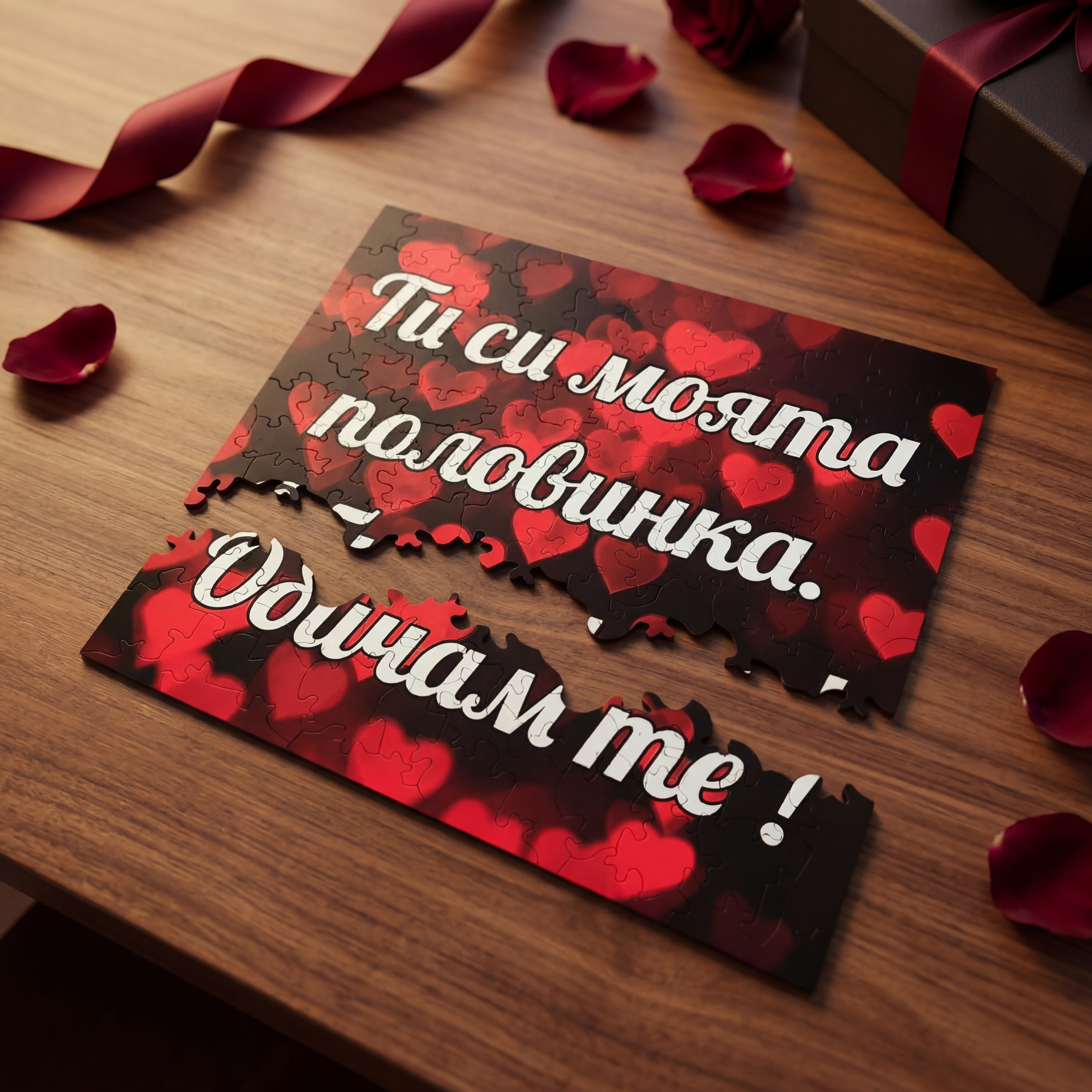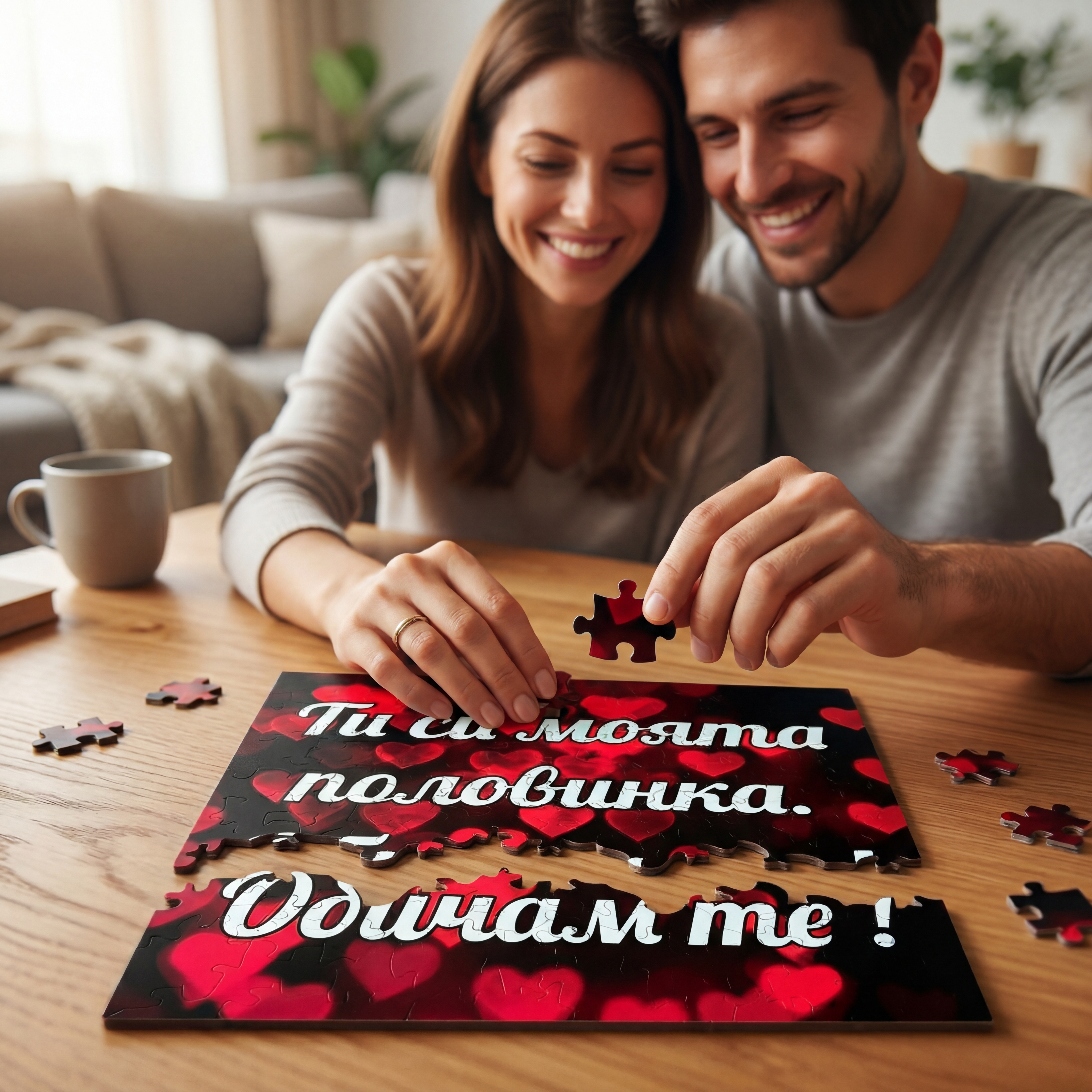Ръчно изработен декоративен дървен пъзел с романтично послание „Ти си моята половинка. Обичам те!“. Нежен, емоционален и запомнящ се подарък, с който можеш да покажеш любовта си по оригинален и специален начин.