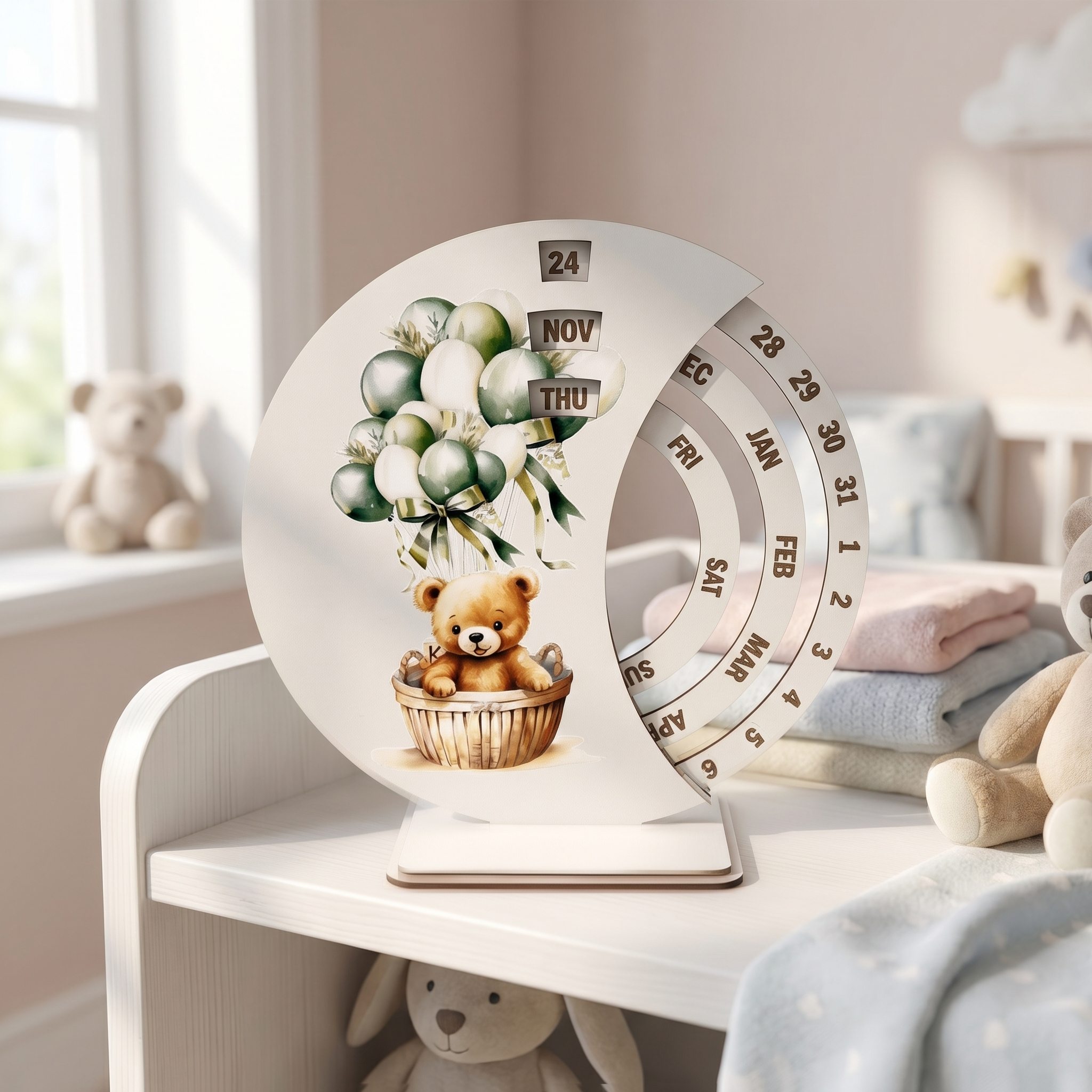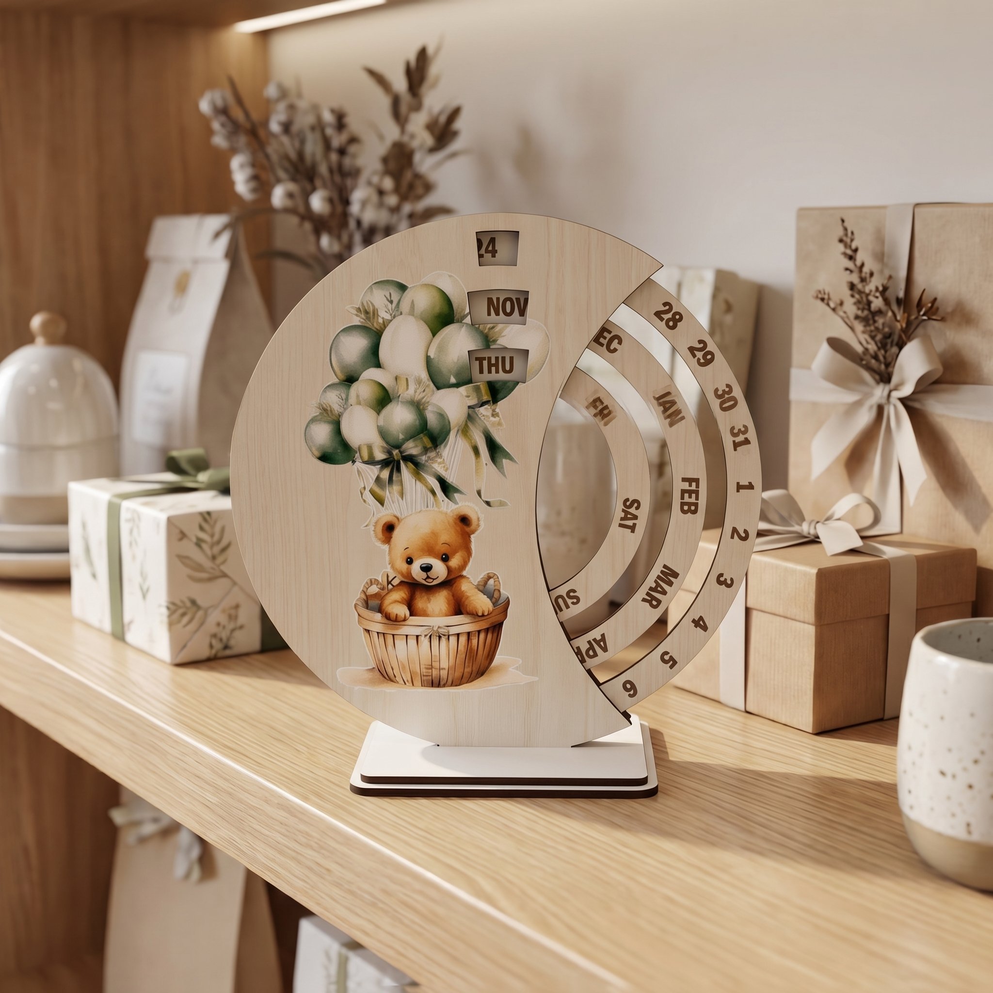 Добавете нежност, стил и очарователен акцент във всеки интериор с този дървен вечен календар за бюро. Дизайнът с мече в кошничка и балони в нежни тонове създава усещане за топлина, уют и празнично настроение. Това е практичен и декоративен аксесоар, който съчетава красива визия и ежедневна употреба.