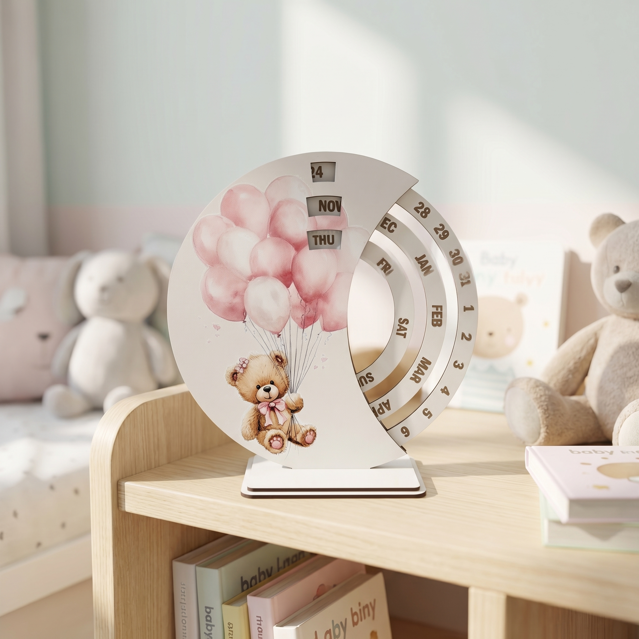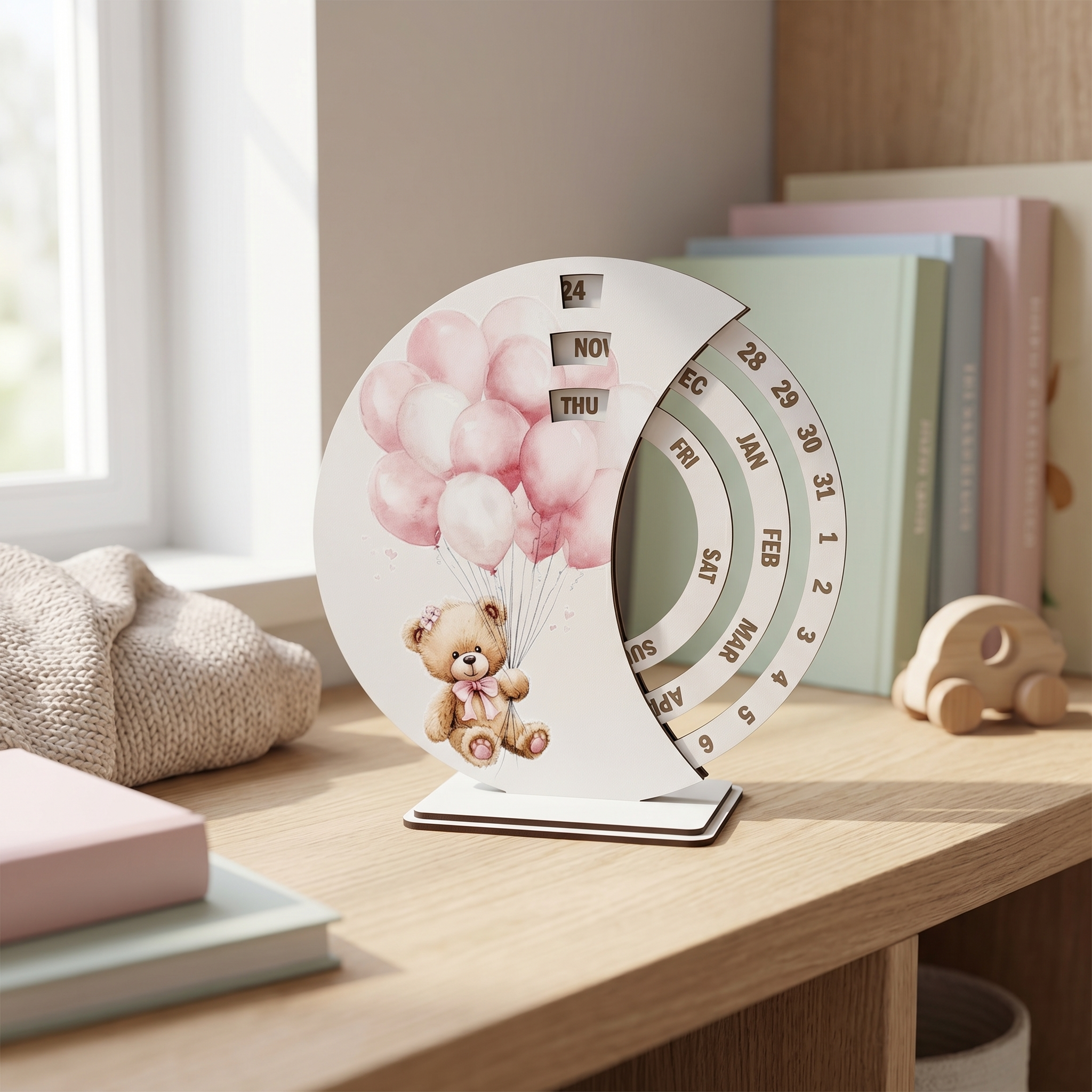 Моделът е подходящ за детска стая, спалня, дневна, офис, библиотека, етажерка или работен кът у дома. Дизайнът с мече и балони внася мекота, романтично излъчване и усещане за празничност, което прави календара прекрасно допълнение към различни интериорни стилове. Дървеният вечен календар съчетава стабилна изработка, практична употреба и визия, която лесно печели вниманието.