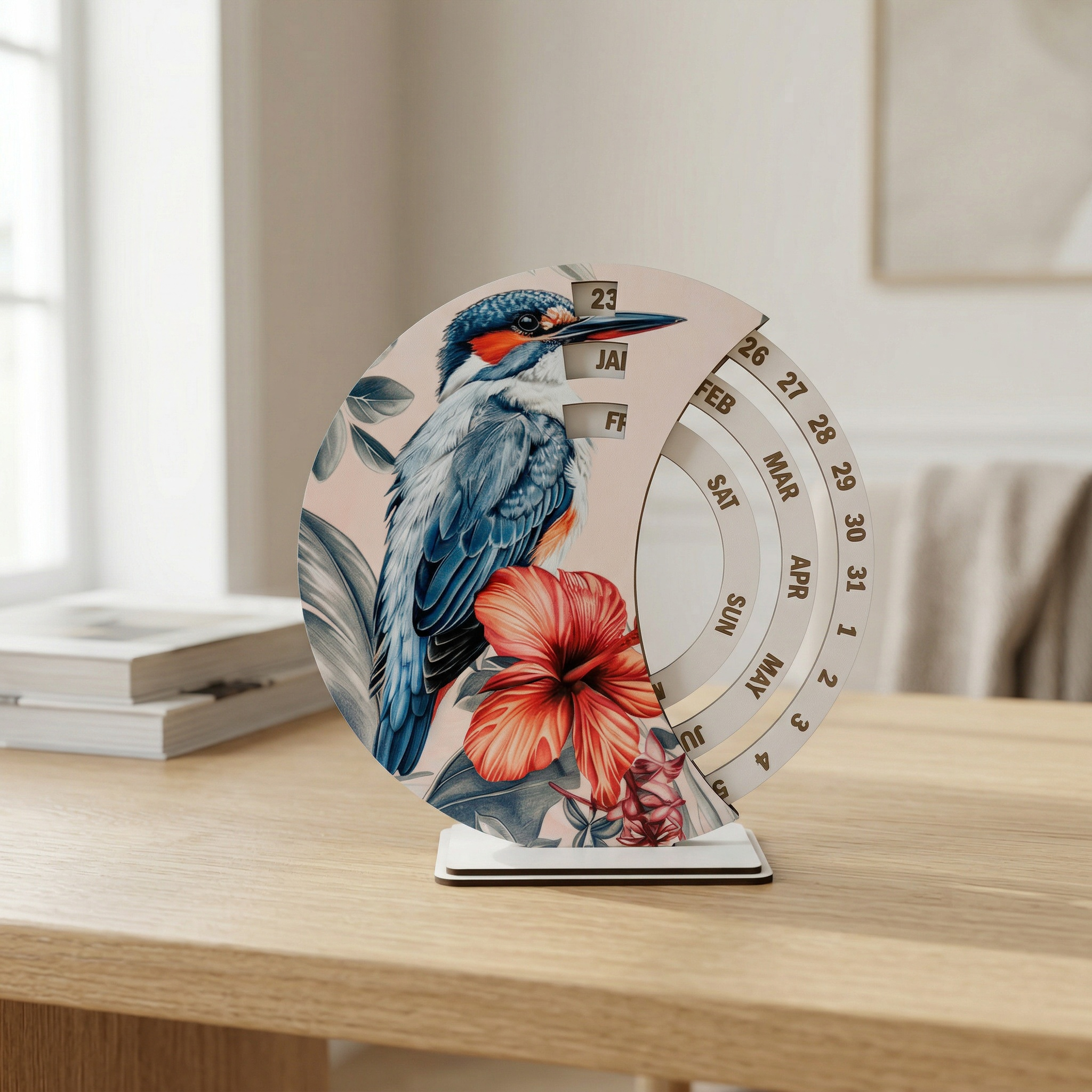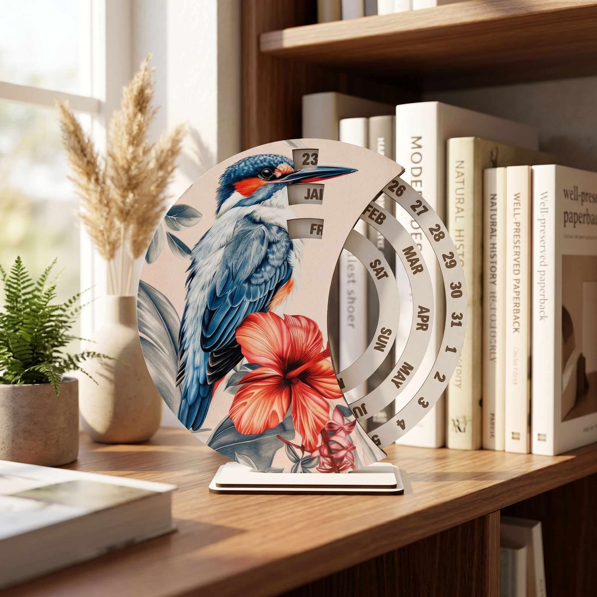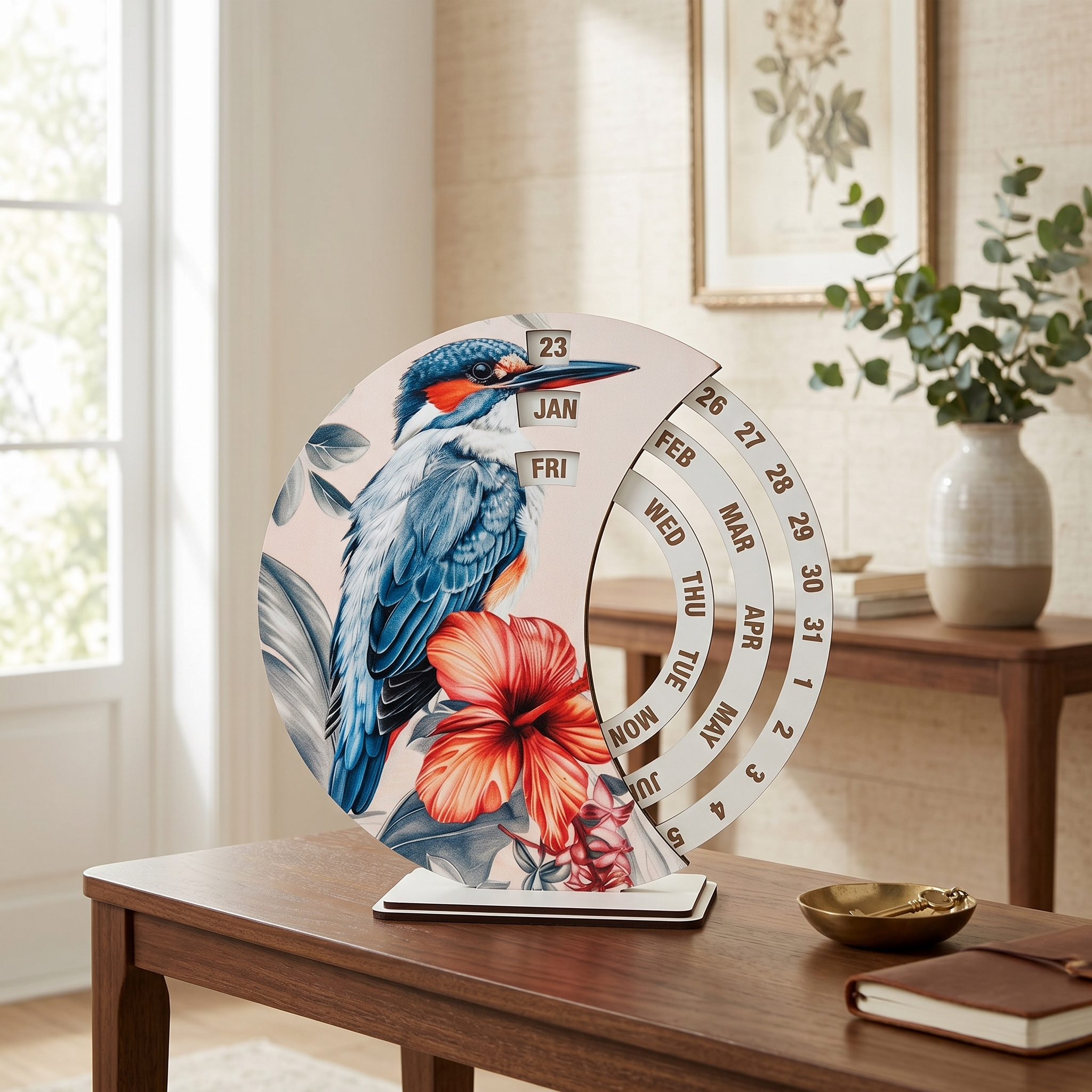 Този модел е чудесен избор за хора, които обичат красивите детайли, природните мотиви и стилните аксесоари. Освен че е полезен в ежедневието, календарът допринася за по-уютна и приятна атмосфера в помещението. Подходящ е за поставяне върху бюро, етажерка, шкаф или работен кът, където ще бъде едновременно функционален и декоративен акцент.