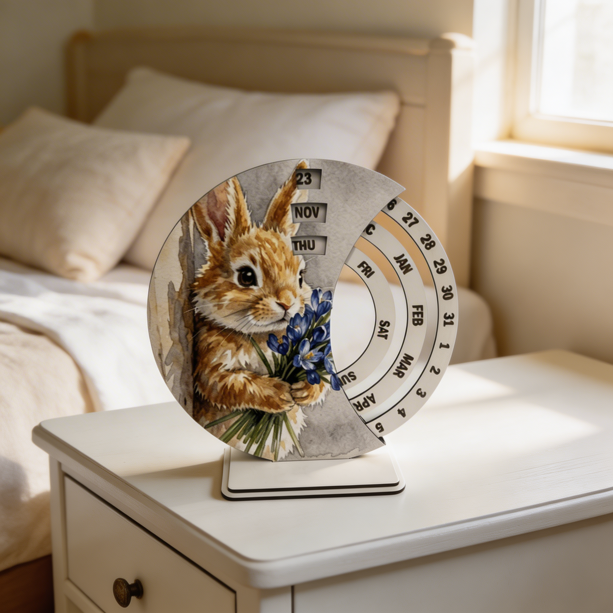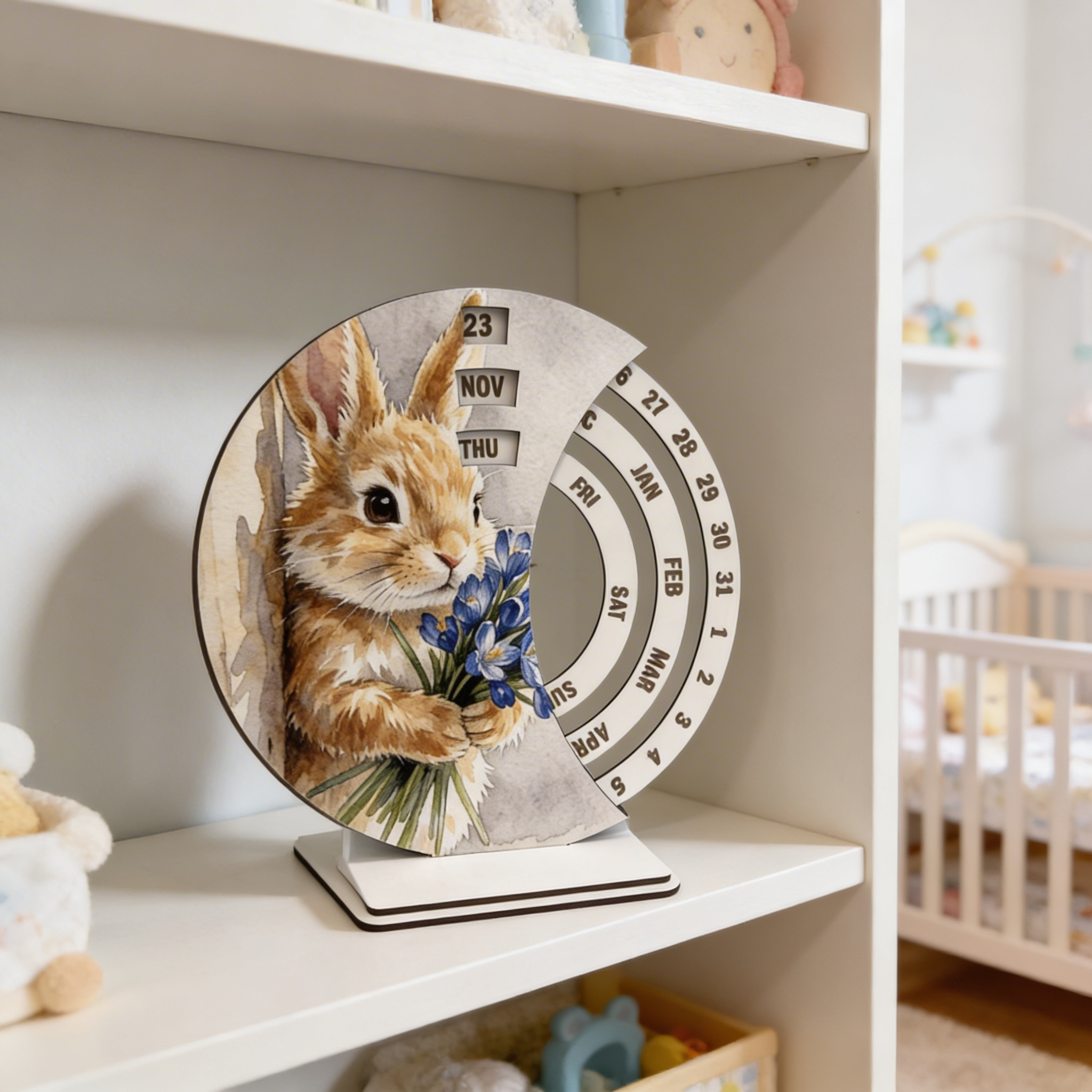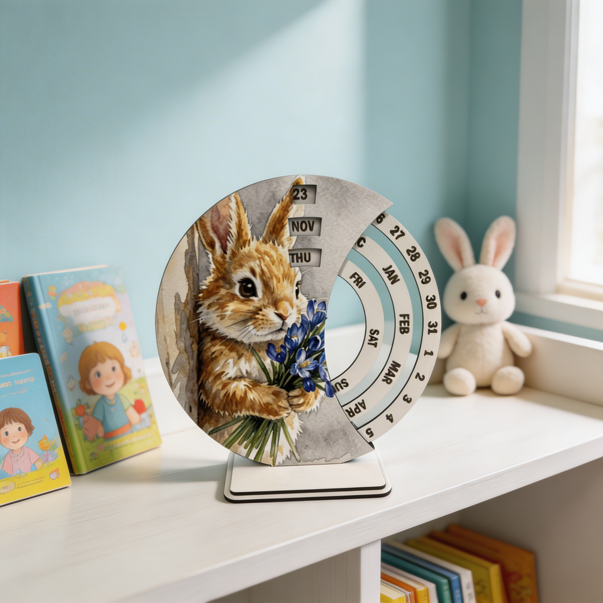 Моделът е подходящ за детска стая, дневна, спалня, офис, библиотека, етажерка или работен кът у дома. Дизайнът със зайче и цветя внася мекота, свежест и очарователно излъчване, което прави календара прекрасно допълнение към различни интериорни стилове. Дървеният вечен календар съчетава стабилна изработка, практична употреба и визия, която лесно печели вниманието.