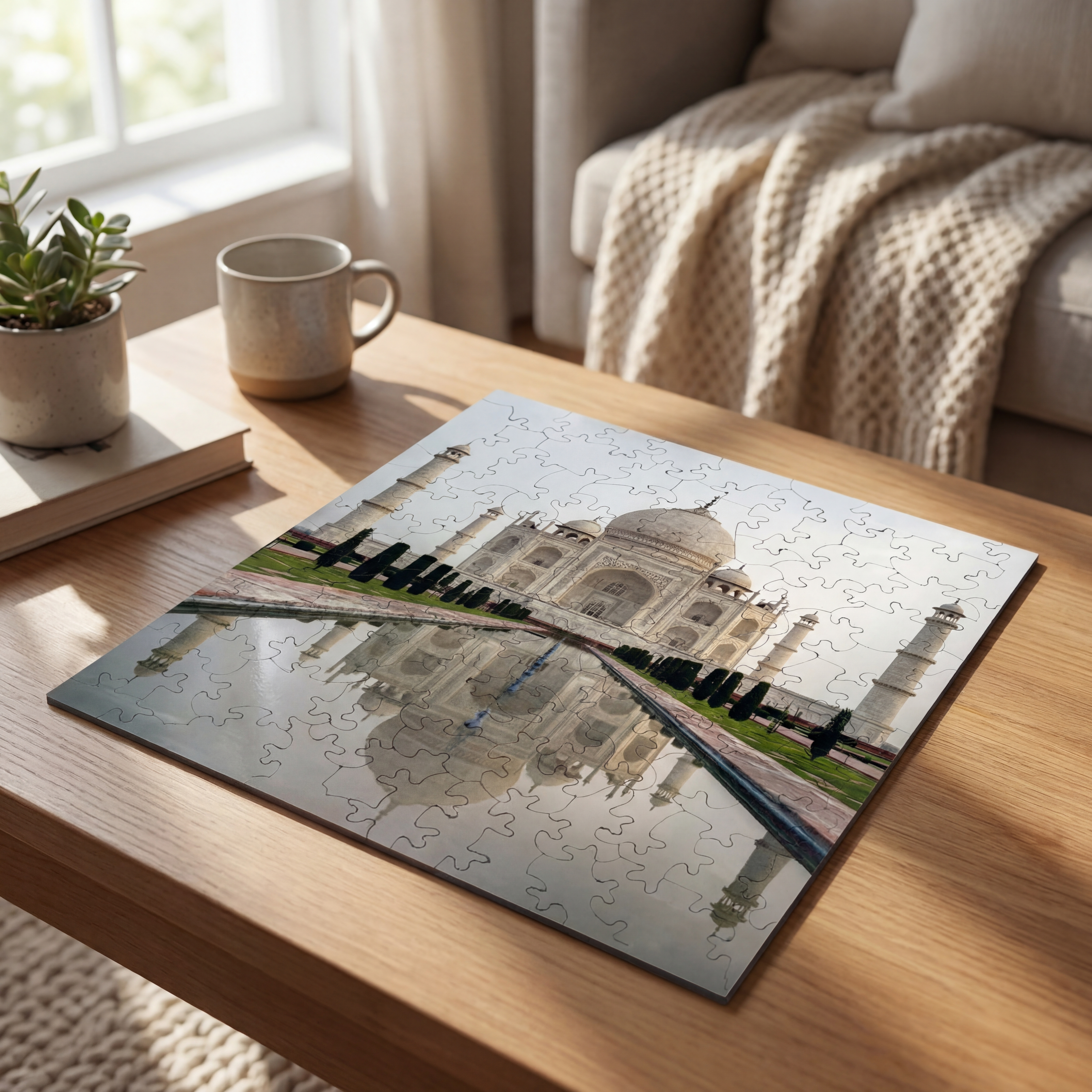 Ръчно изработен декоративен дървен пъзел с изображение на Тадж Махал – една от най-впечатляващите и разпознаваеми архитектурни забележителности в света. Стилен и елегантен модел, подходящ за подарък, декорация или за всеки, който обича красиви гледки, пътешествия и емблематични световни символи.