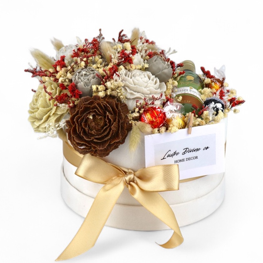 Подарък, който впечатлява още с първи поглед – кутия “Гурме Елегантност“ съчетава изтънчена визия с ароматен разкош. Ръчно аранжирана композиция от стилни соеви свещи и цветя в натурални тонове, комбинирана с бутилка качествено вино и подбрани бонбони Lindt – всички поднесено в луксозна кутия с кадифена панделка в златисто.
