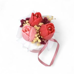 Нежен и изискан подарък – този малък соев букет включва ръчно изработени свещи във формата на лалета, излъчващи свеж и флорален аромат на истински лалета. Създаден от 100% натурален соев восък, букетът впечатлява с преливащи розови тонове и фини сухи цветя.