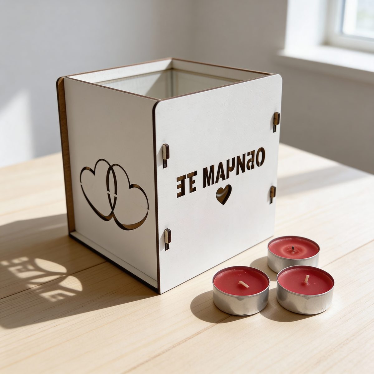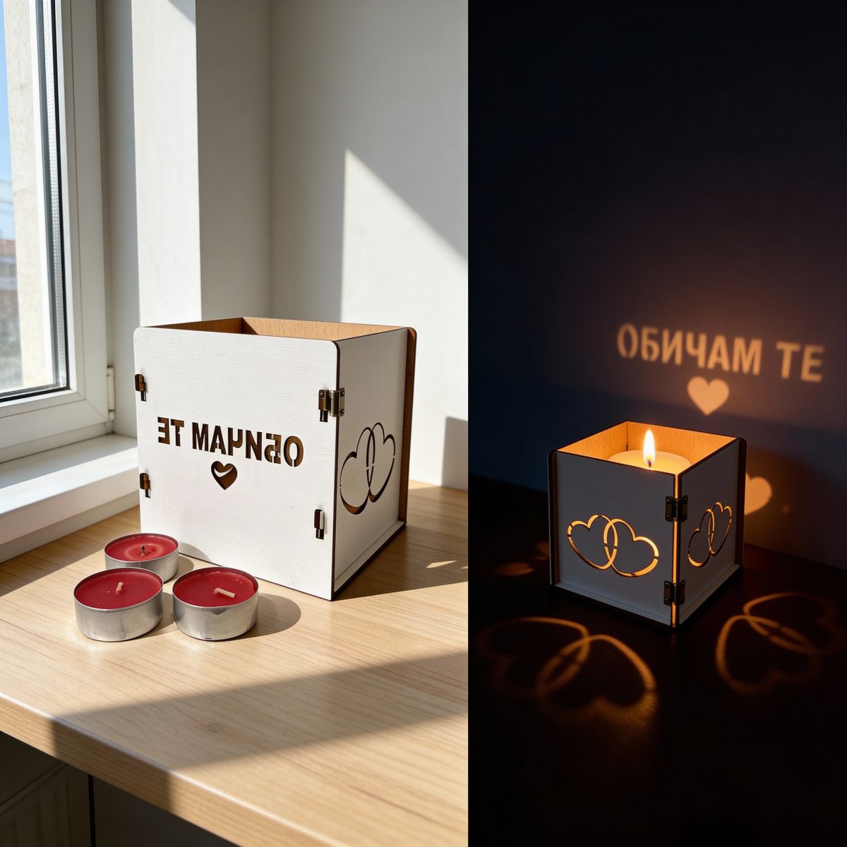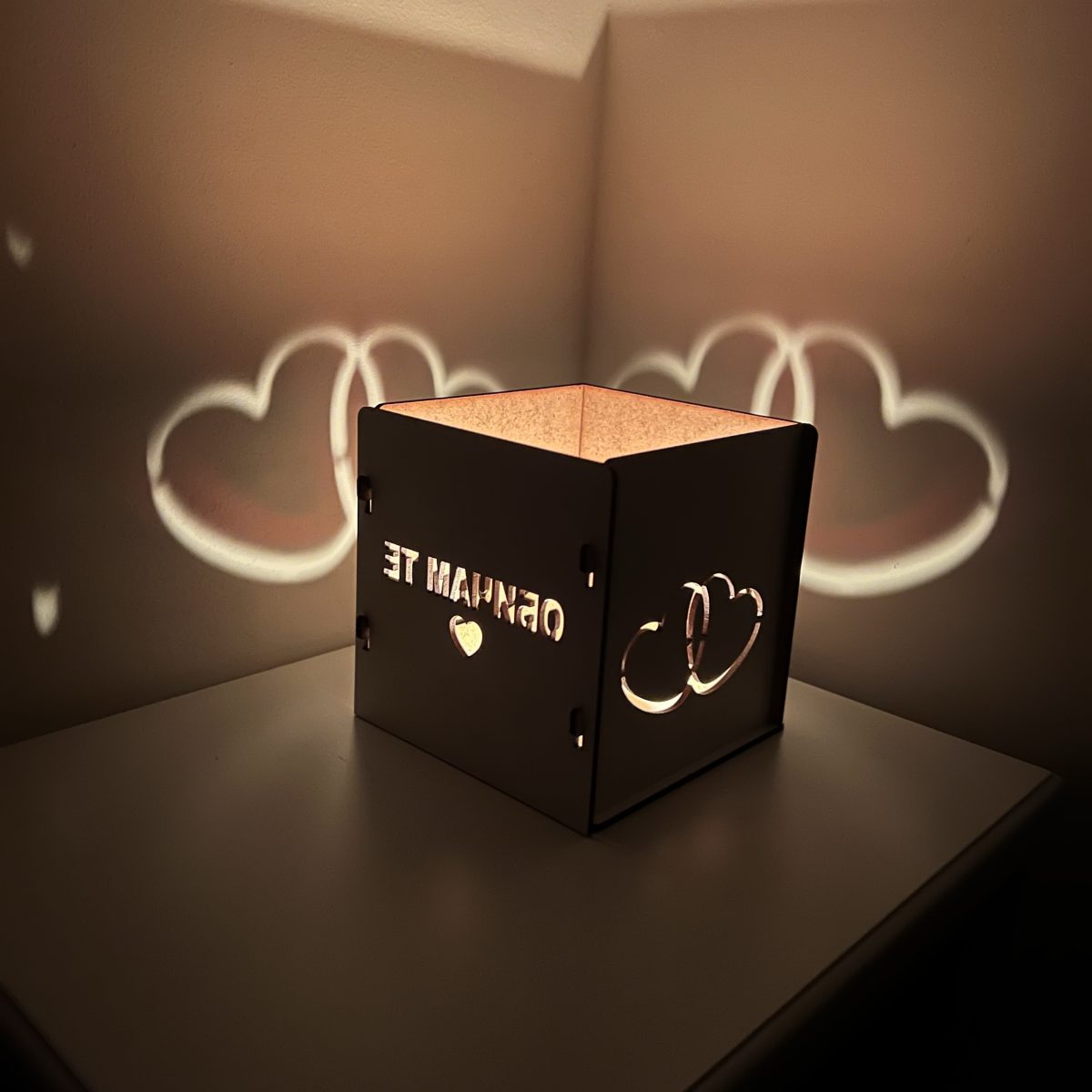 обикновената чаена свещ в магично изживяване. Меката светлина преминава през изрязаните сърца и думи,