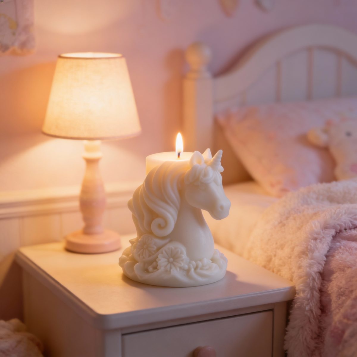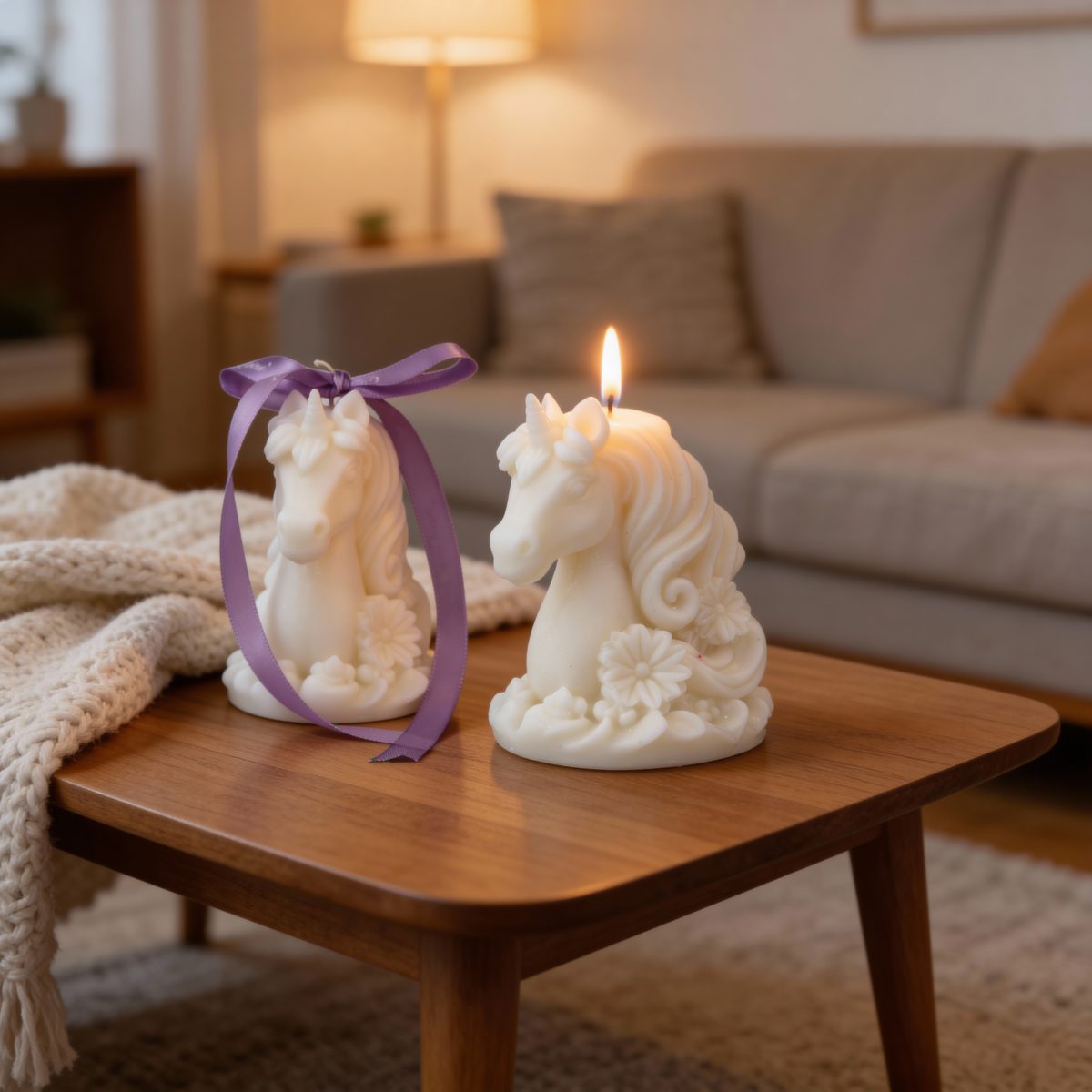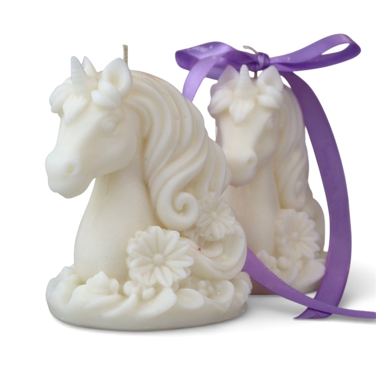 Потопи се в свят на магия и нежност с тази очарователна соева свещ във формата на еднорог.