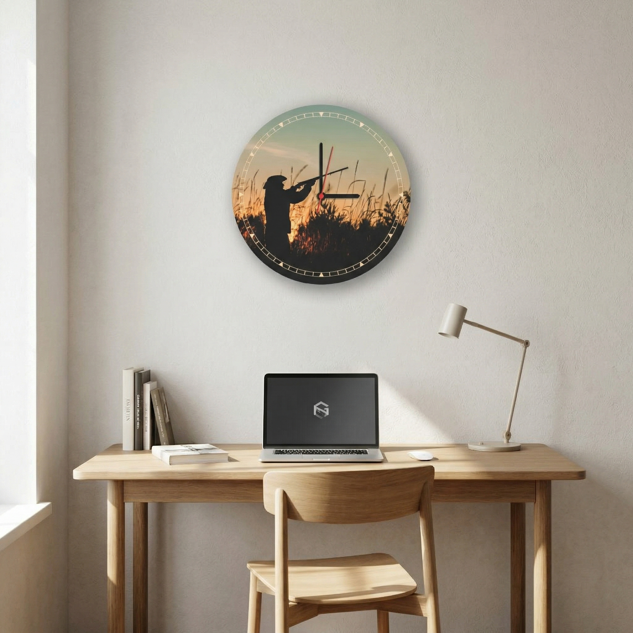 Стенен часовник „Ловец при залез“ с размер 29 см е елегантен декоративен акцент, вдъхновен от спокойствието и красотата на природата. Силуетът на ловец на фона на залязващото слънце създава топла и въздействаща атмосфера, която придава уют и характер на всяко помещение.