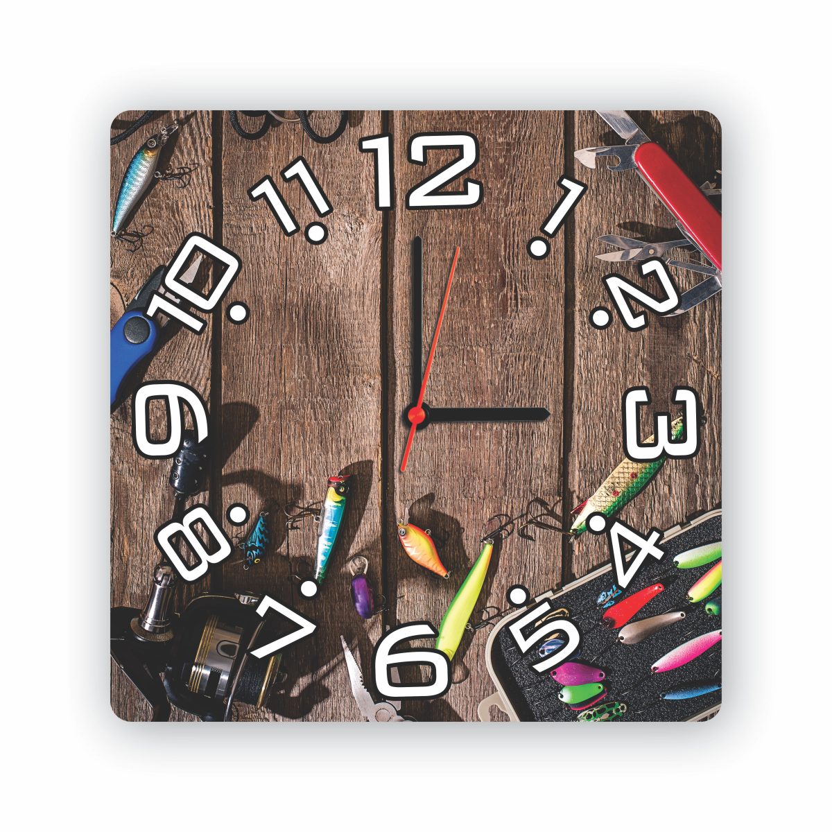 Стенен часовник „Риболовна екипировка“ с размер 29 см е създаден за истинските любители на риболова. Дизайнът включва разнообразие от воблери, макари и аксесоари, подредени върху дървена основа, което създава автентично усещане за подготовка преди риболов.