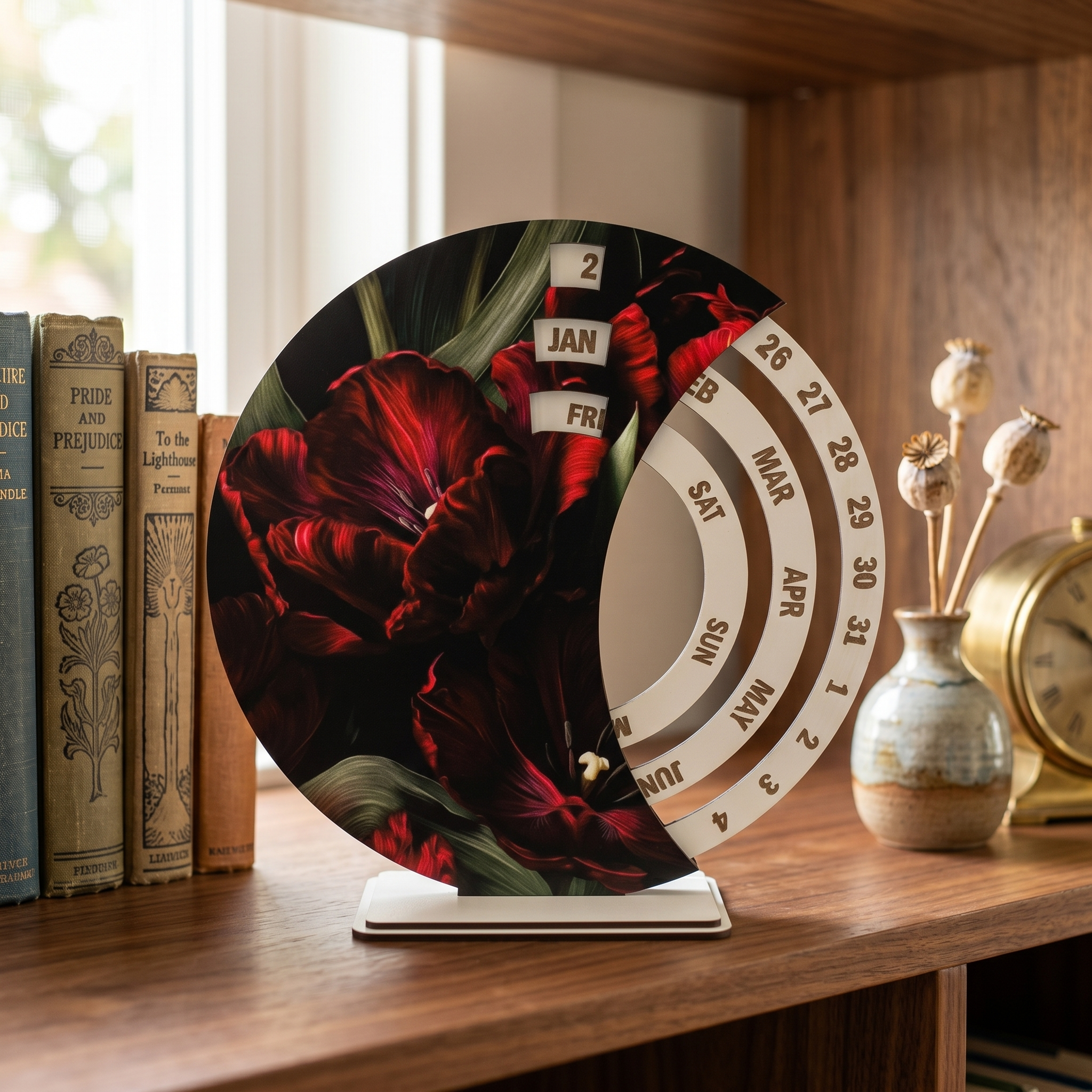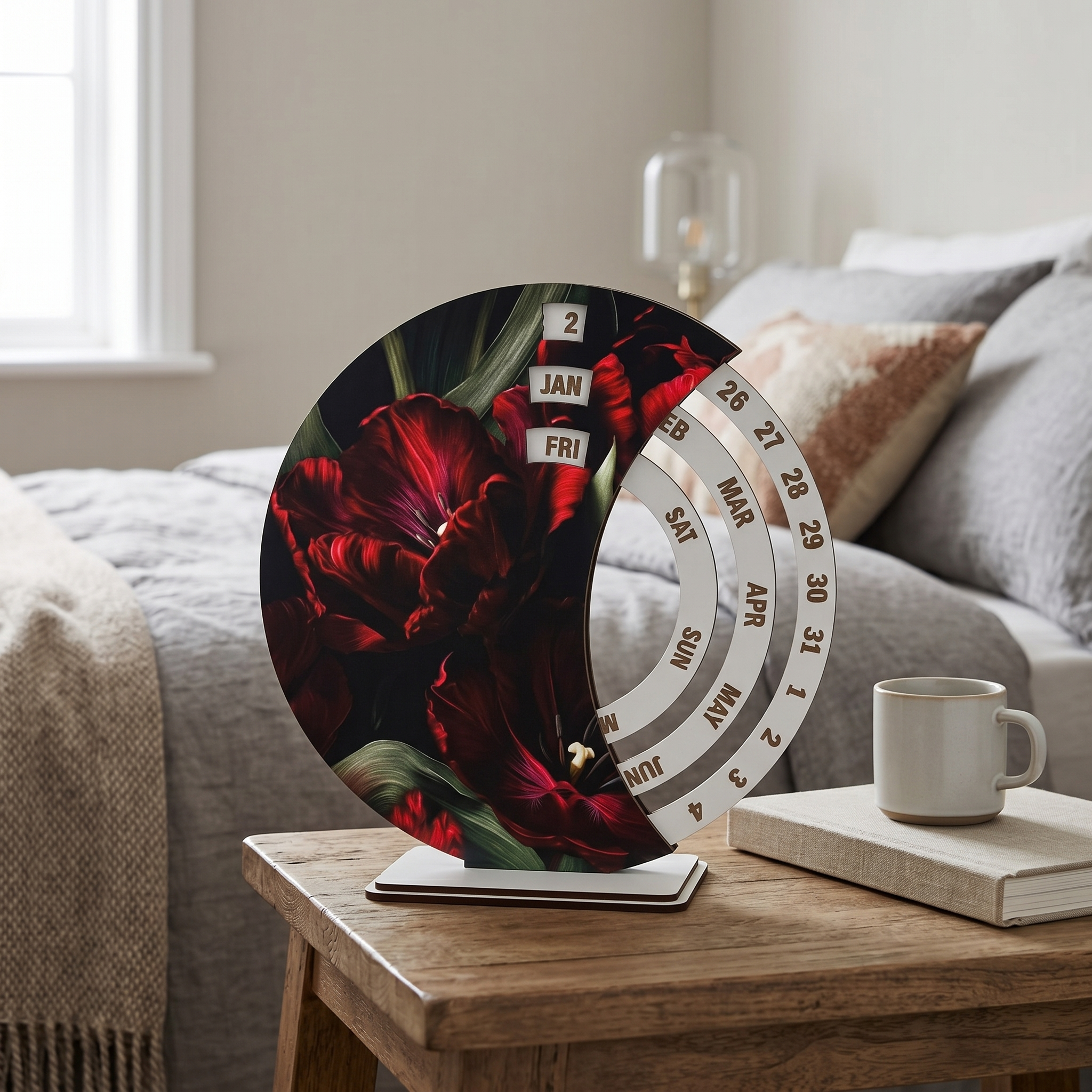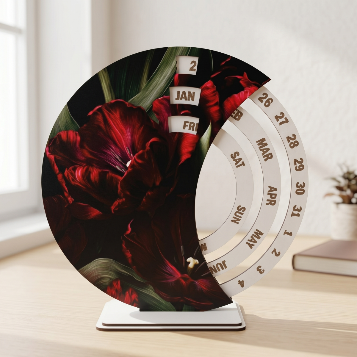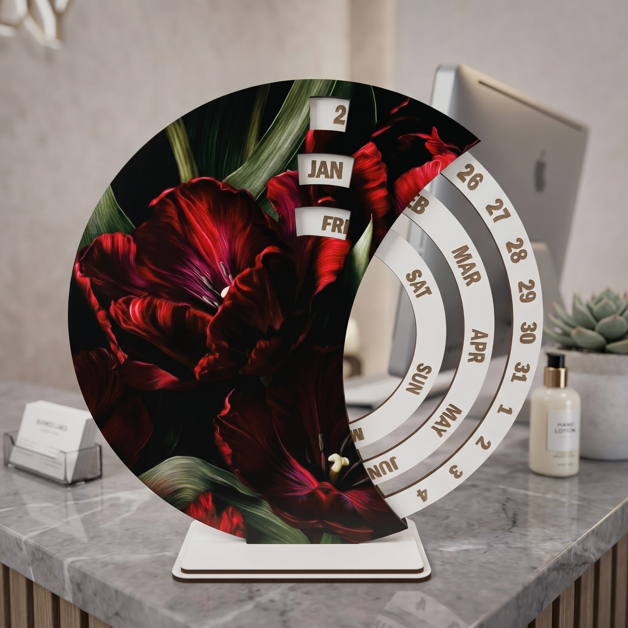 Добавете стил, дълбочина и изискан акцент във всеки интериор с този вечен календар за бюро. ✨ Изработен от 10 мм МДФ, моделът впечатлява с наситен флорален дизайн в тъмни и елегантни тонове, който създава усещане за лукс, уют и характер. Това е декоративен аксесоар, който не просто показва датата, а привлича внимание и придава завършен вид на всяко пространство. 🌺