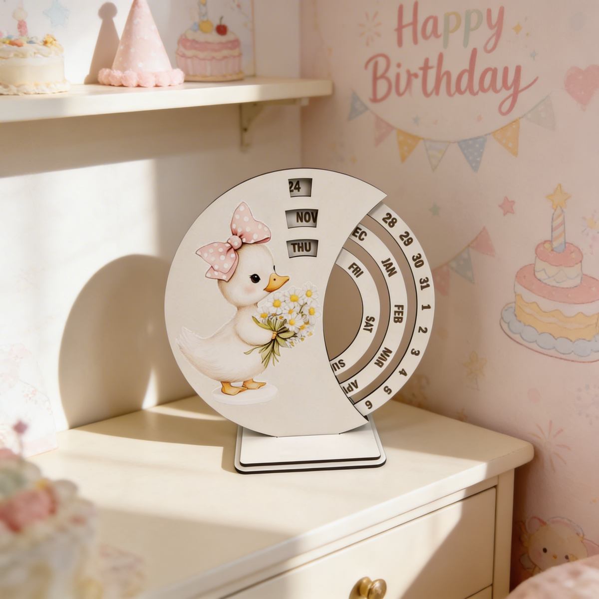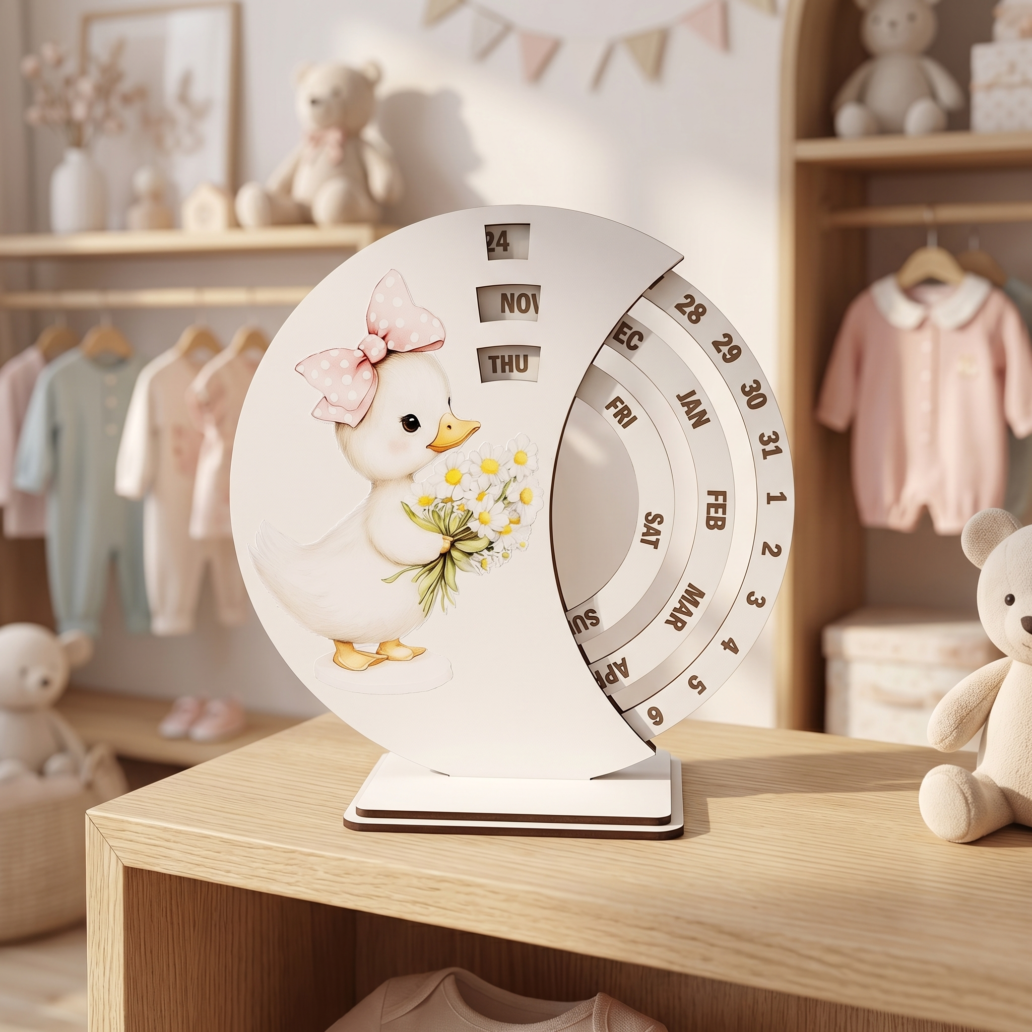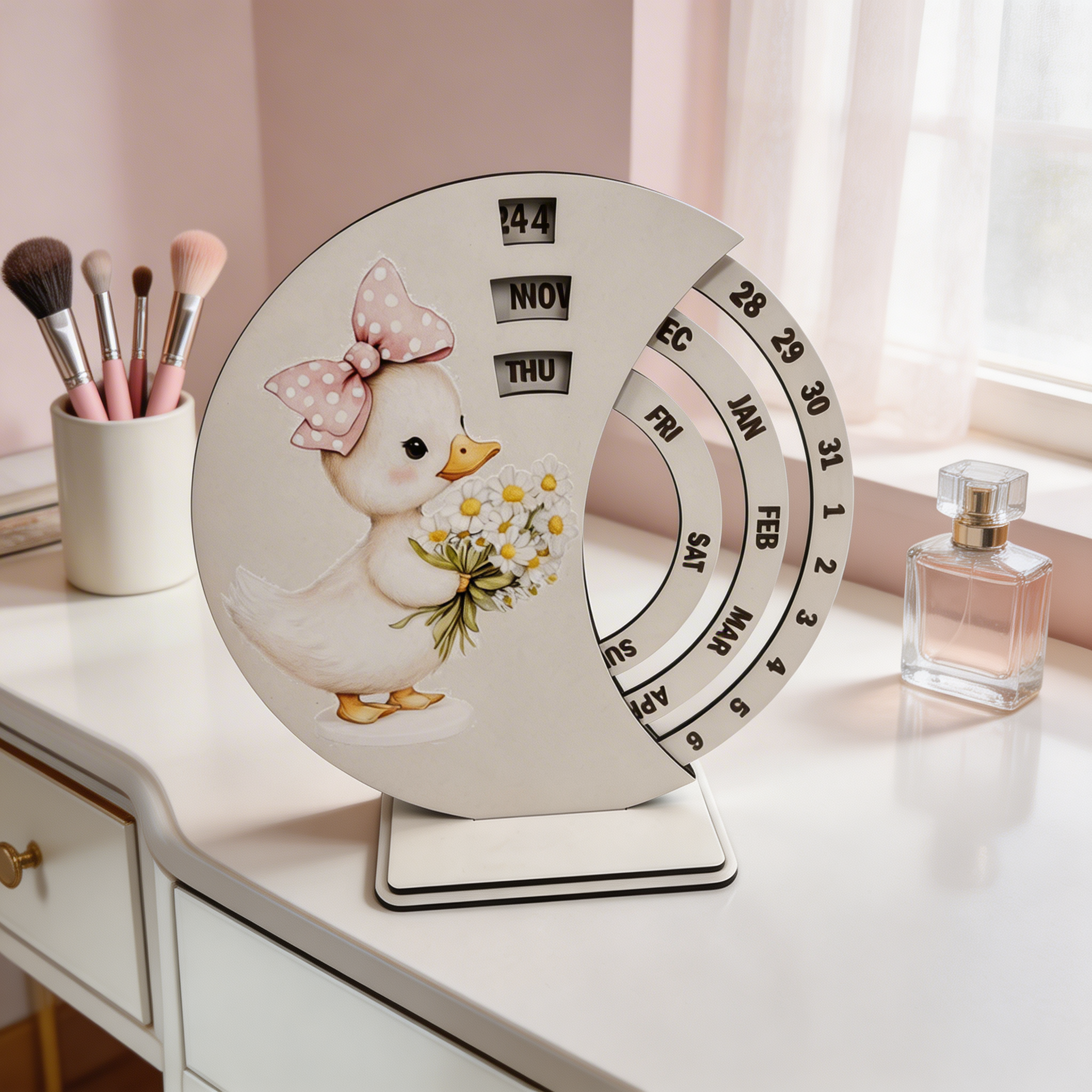 Добавете нежност, усмивка и очарователен акцент във всеки интериор с този дървен вечен календар за бюро. Дизайнът със сладко патенце, нежна панделка и букет цветя носи усещане за чистота, уют и топлина, което го прави прекрасно допълнение към дома, детската стая или офиса. Това е практичен и декоративен аксесоар, който съчетава красива визия и ежедневна употреба.