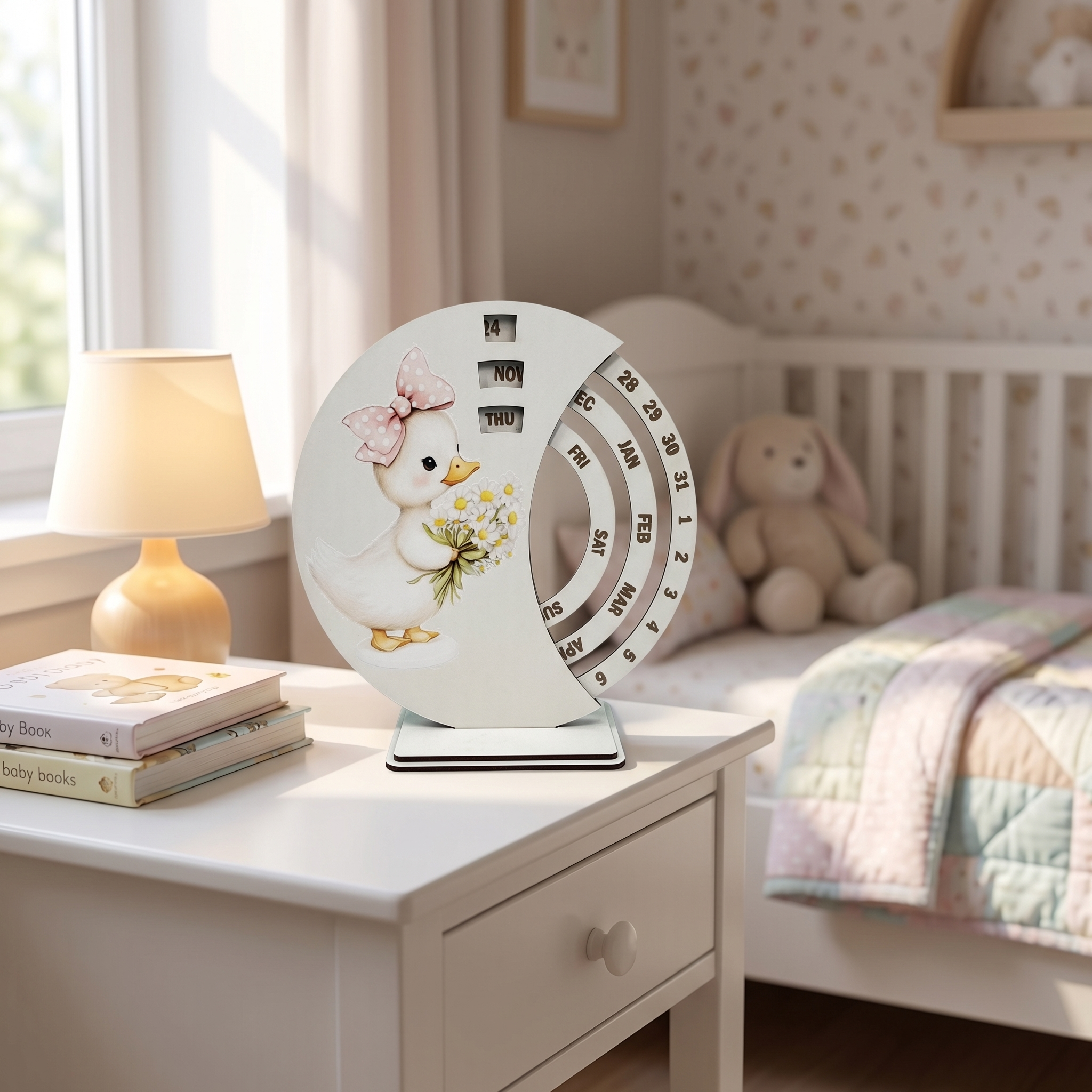 Моделът е подходящ за детска стая, дневна, спалня, офис, библиотека, етажерка или работен кът у дома. Дизайнът с патенце и цветя внася мекота, свежест и чаровно излъчване, което прави календара прекрасно допълнение към различни интериорни стилове. Дървеният вечен календар съчетава стабилна изработка, практична употреба и визия, която лесно печели вниманието.