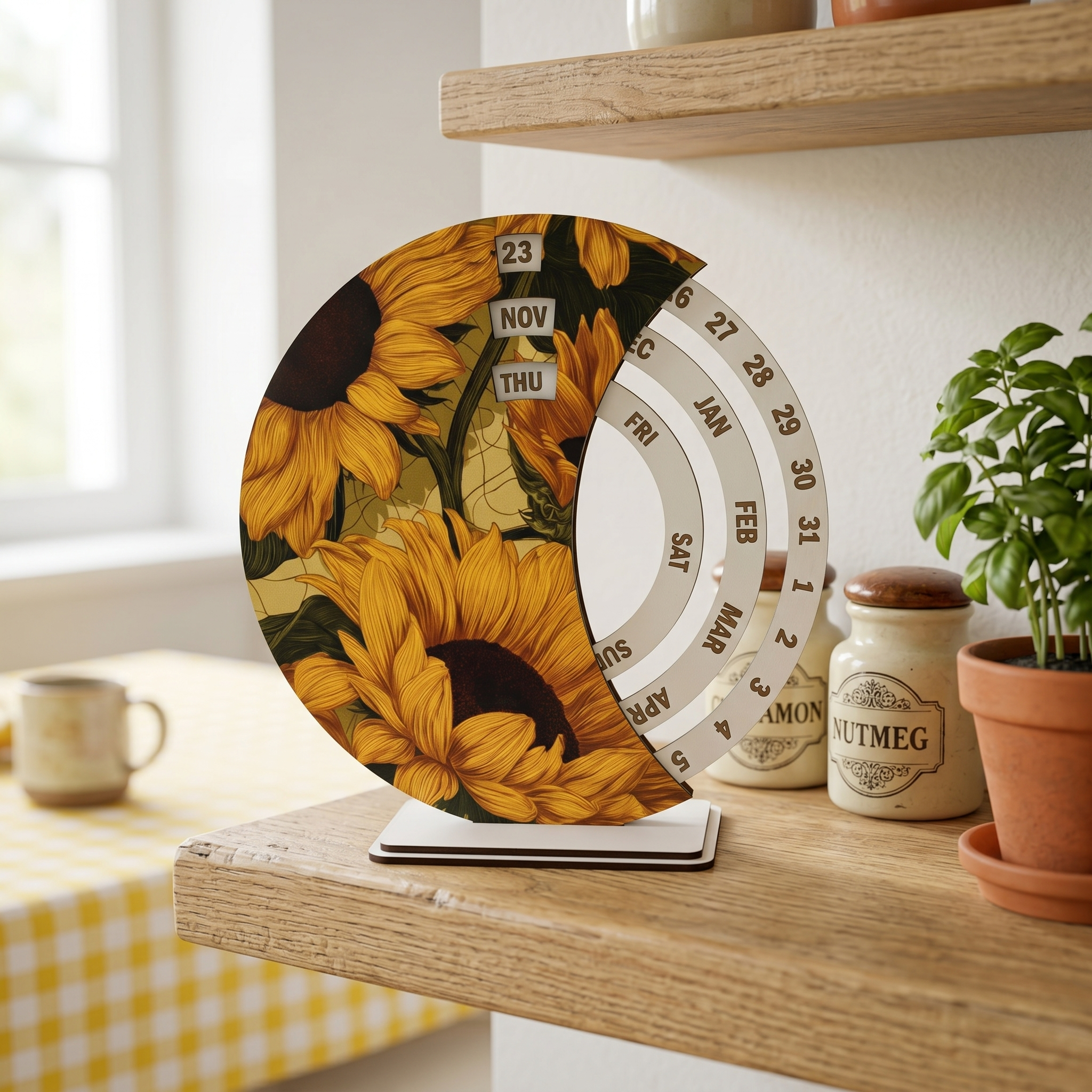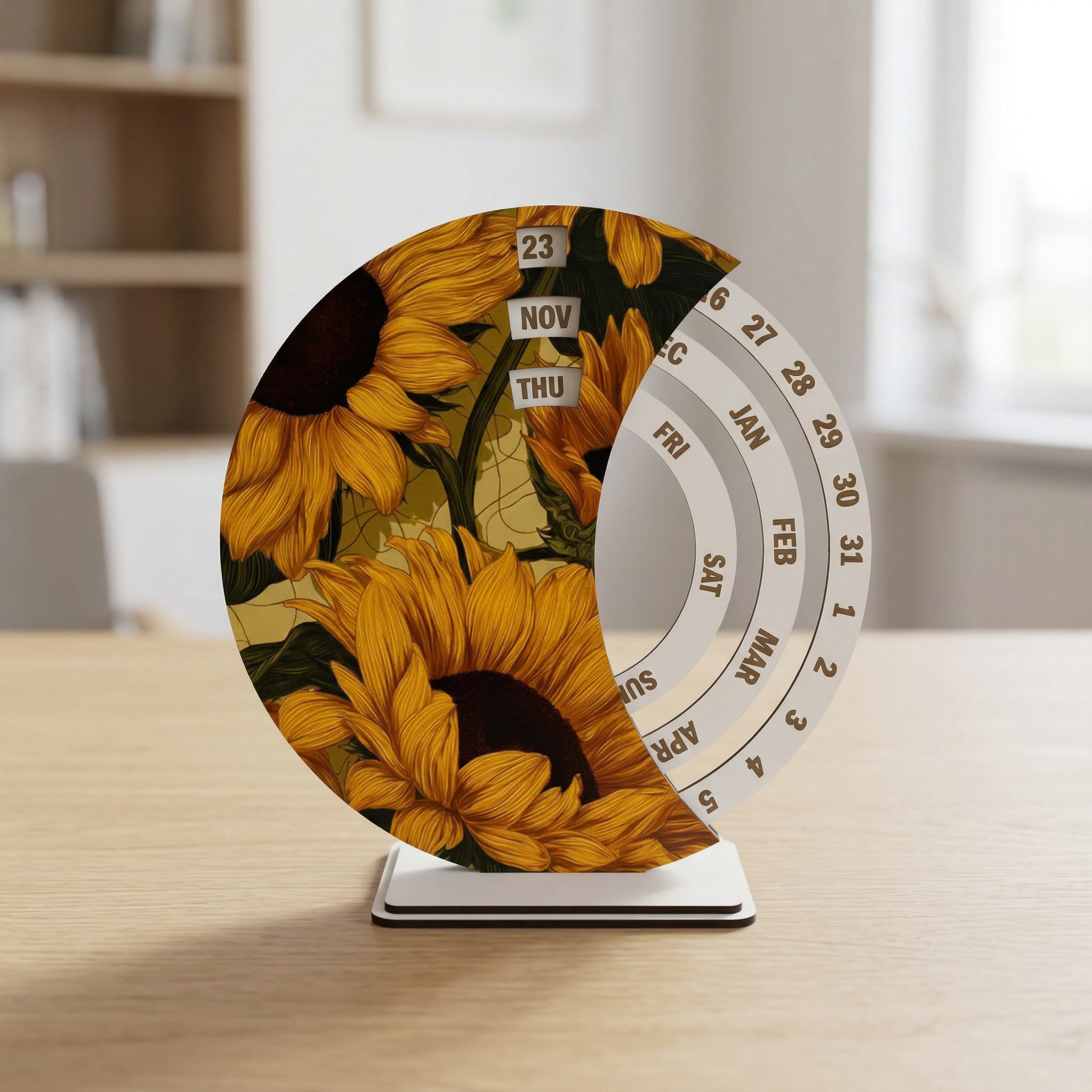 Моделът е подходящ за дневна, кухня, офис, библиотека, етажерка или работен кът у дома. Дизайнът със слънчогледи внася усещане за топлина, светлина и естествена красота, което прави календара чудесно допълнение към различни интериорни стилове. Дървеният вечен календар съчетава стилна визия, стабилна изработка и практична употреба през цялата година.